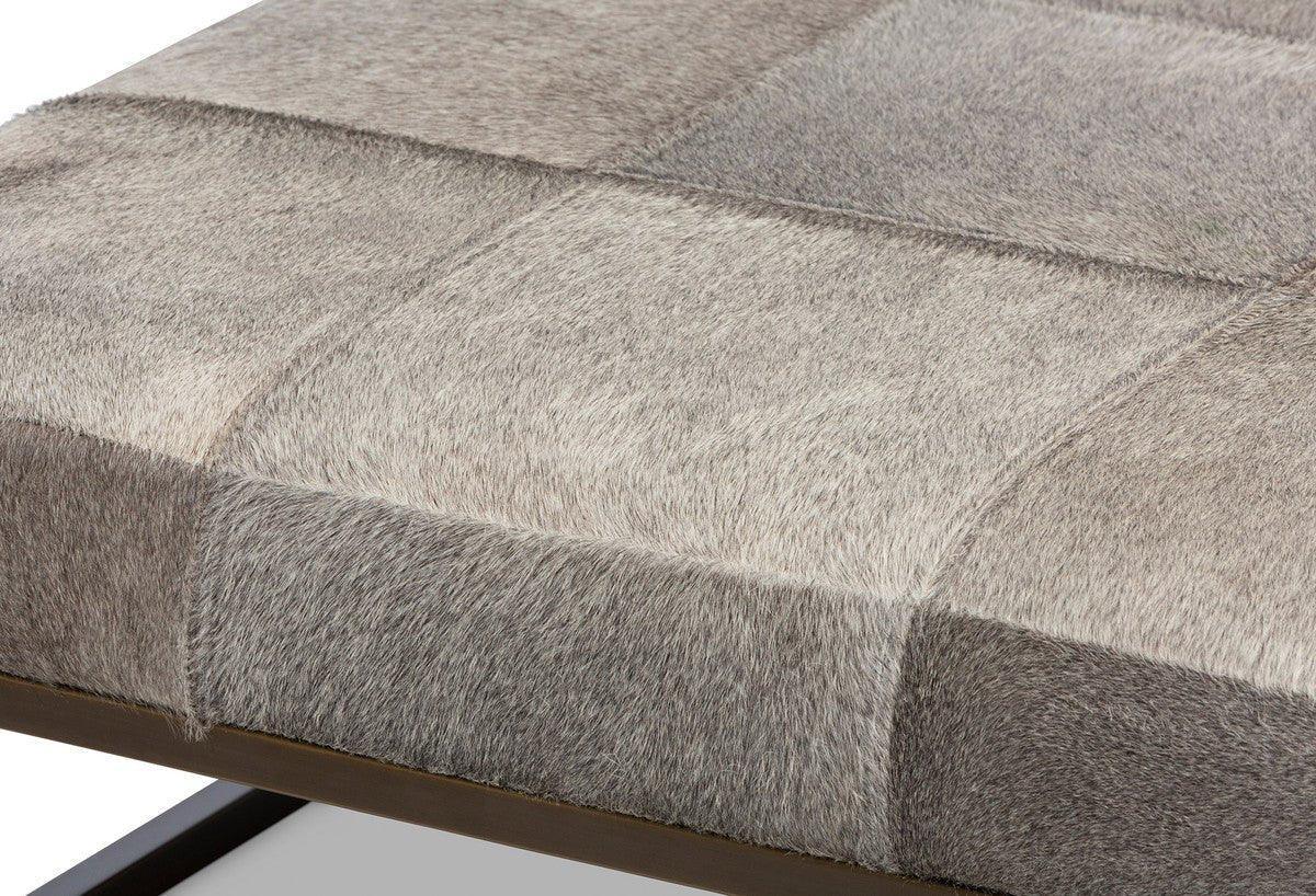 This exquisite Grey Cowhide Ottoman will inject a touch of charm into any room! The patchwork design on its top, coupled with a plaited iron base, imbues it with a distinctive rustic modern edge. It can be employed as a chic coffee table or inviting footrest - it's sure to become a favorite centerpiece!