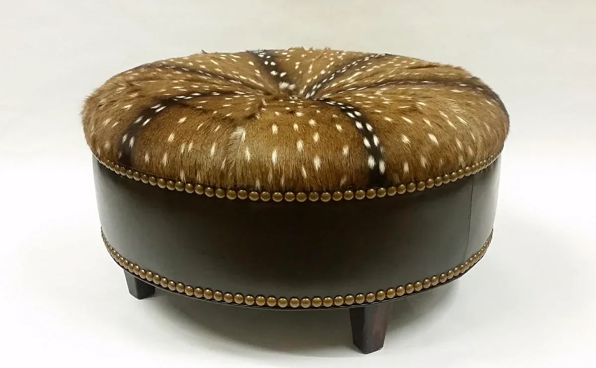 Indulge in the refined luxury and rustic elegance of our Leather & Axis Hide Ottoman, a distinguished addition to any lodge-inspired or rustic interior. Available in six sizes and a selection of exquisite upholstery options, this meticulously handcrafted round ottoman is fashioned from genuine leather and hair-on Axis Deer hide. Its perimeter is gracefully wrapped in matching leather, enhancing its sophisticated design. Supported by four sturdy legs, the piece exemplifies superior craftsmanship, while the dual rows of aged nail head trim offer a subtle yet striking finishing detail. Elevate your space with this timeless and elegant accent.