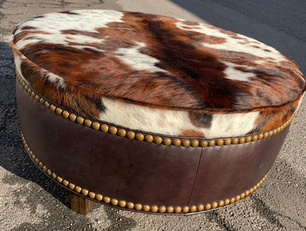 The rustic charm of our handcrafted round western ottoman is beautifully crafted with genuine brown and white hair on cowhide. The perimeter of the stool is adorned with coordinating medium brown top grain smooth leather for a luxurious touch. Set on four sturdy legs, this ottoman exudes both style and quality. Our attention to detail is evident with two rows of continuous aged nail head trim, adding the perfect finishing touch to your ottoman.
