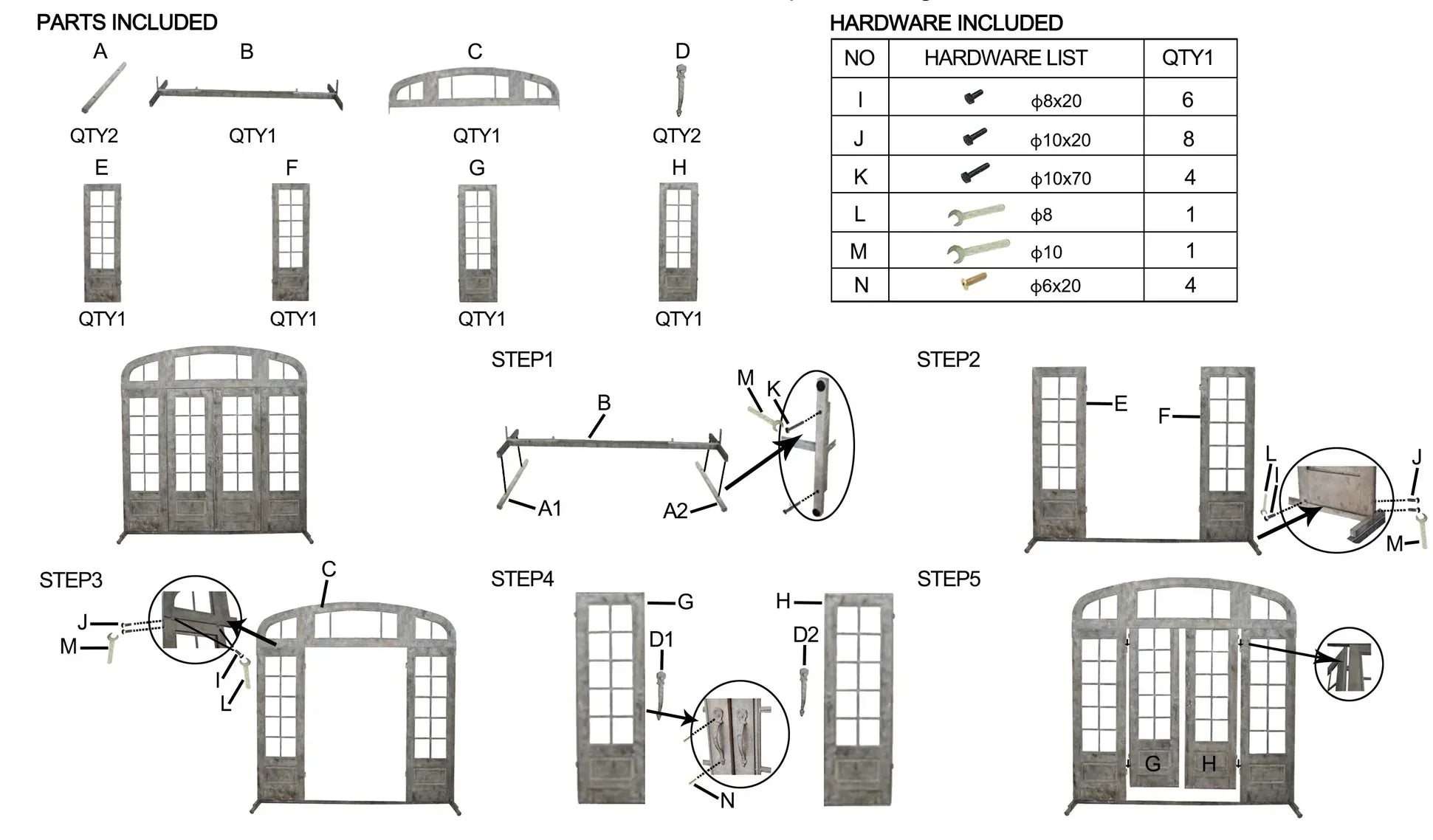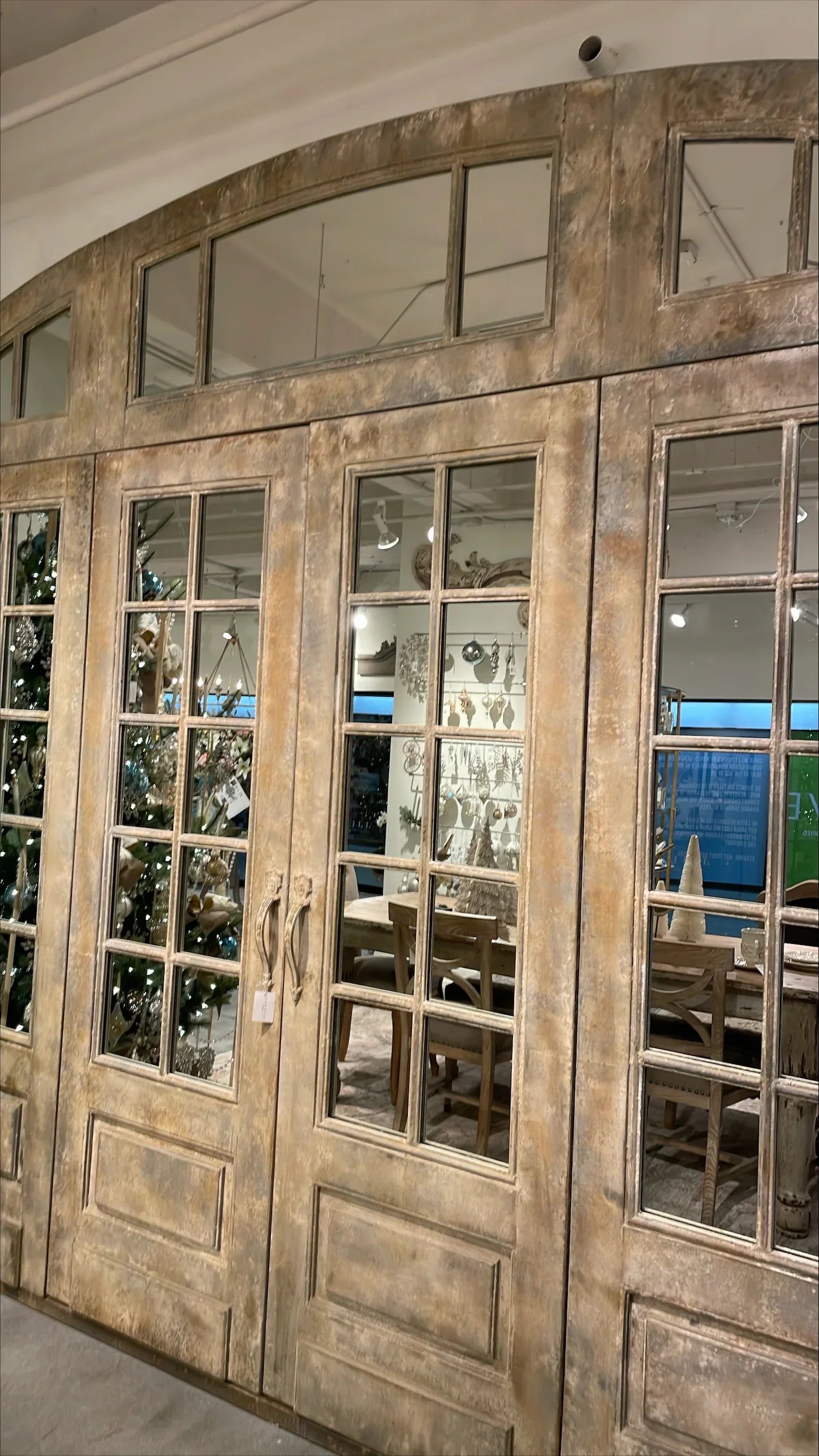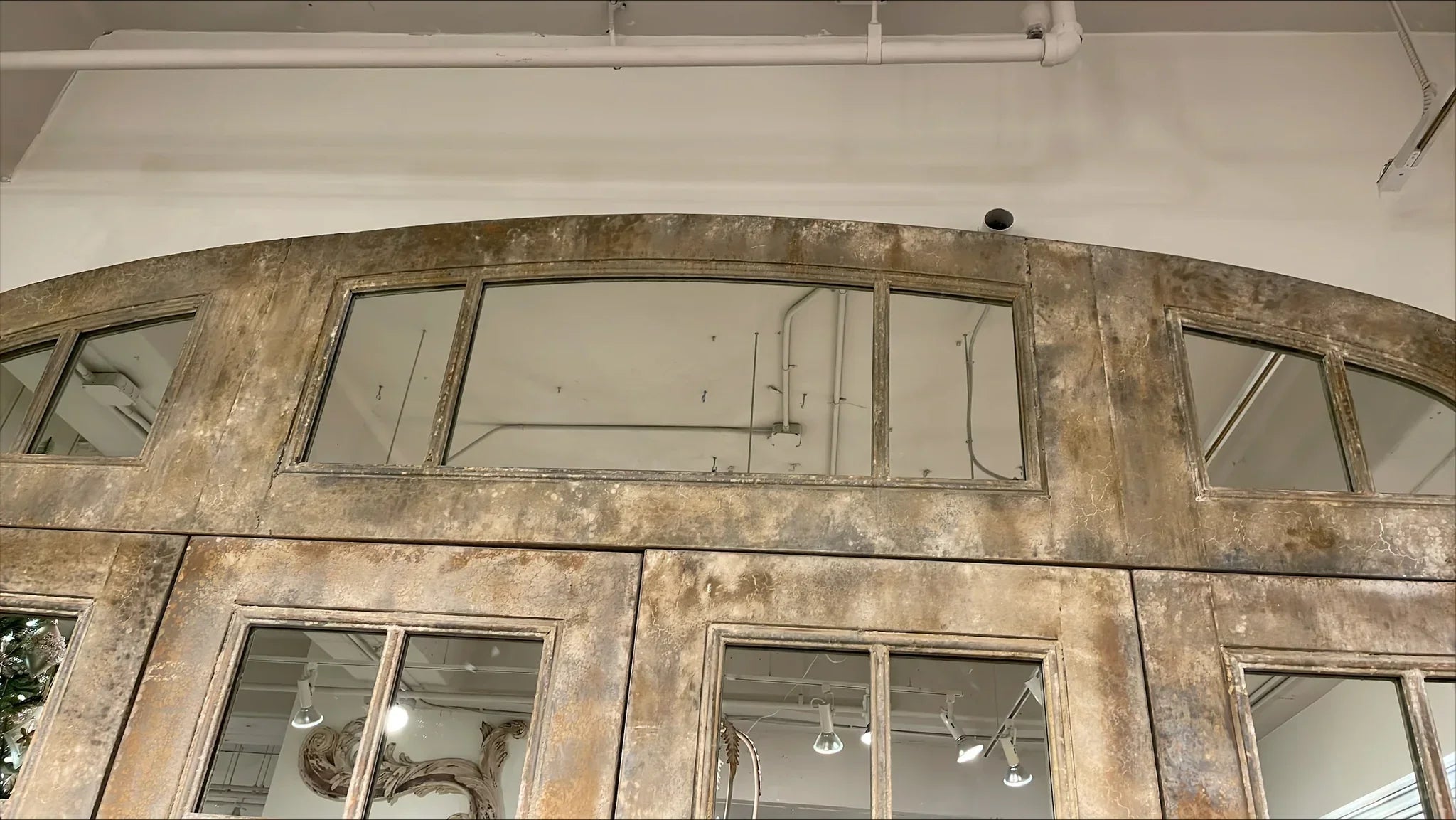Inspired by the charm of a vintage French chateau, this Rustic Metal French Door Façade showcases a hinged double door flanked by side window panes and topped with a transom. Its weathered, aged patina finish adds authentic rustic appeal, making it an eye-catching statement piece for any space or occassion.