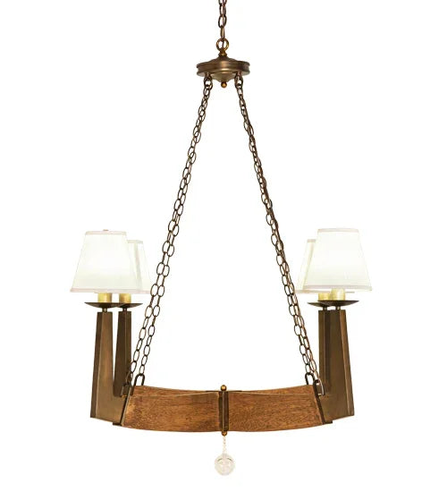 Our City Centre Chandelier is for those who like to go with the grain, and those who like to go against it. The sophisticated Textrene shades crown candlelights on bobeches. The white shades are complimented with a rustic Oak frame and an antique copper finish. To add elegance to this rather rustic fixture, hangs a Czech Crystal finial.