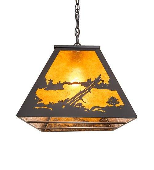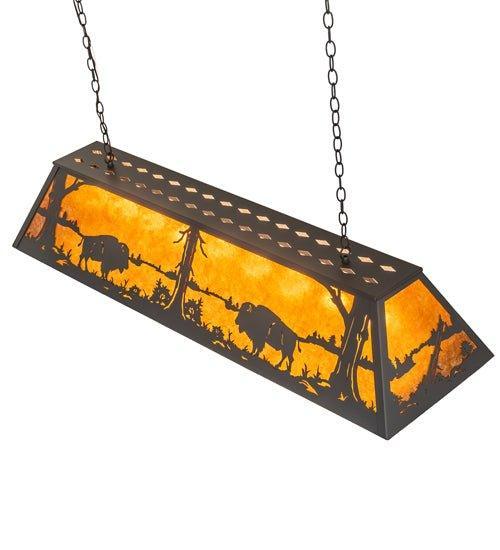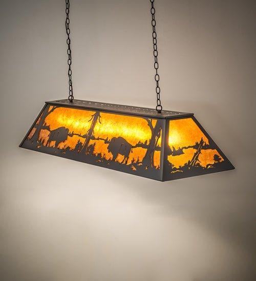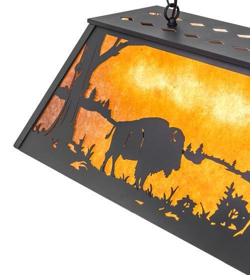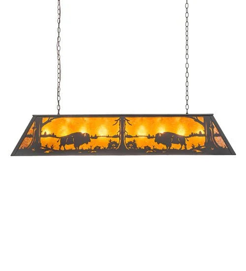 Light up your home with the beautiful Lake Buffalo Oblong Pendant! Custom-crafted with wrought iron for a luxurious western-style lighting scheme, it will give off a warm ambient light to uplift your space. The majestic Buffalo are depicted in all of their glory at lakeside as the morning sun rises in the background of this pendant. Create a peaceful atmosphere with this magnificent pendant!