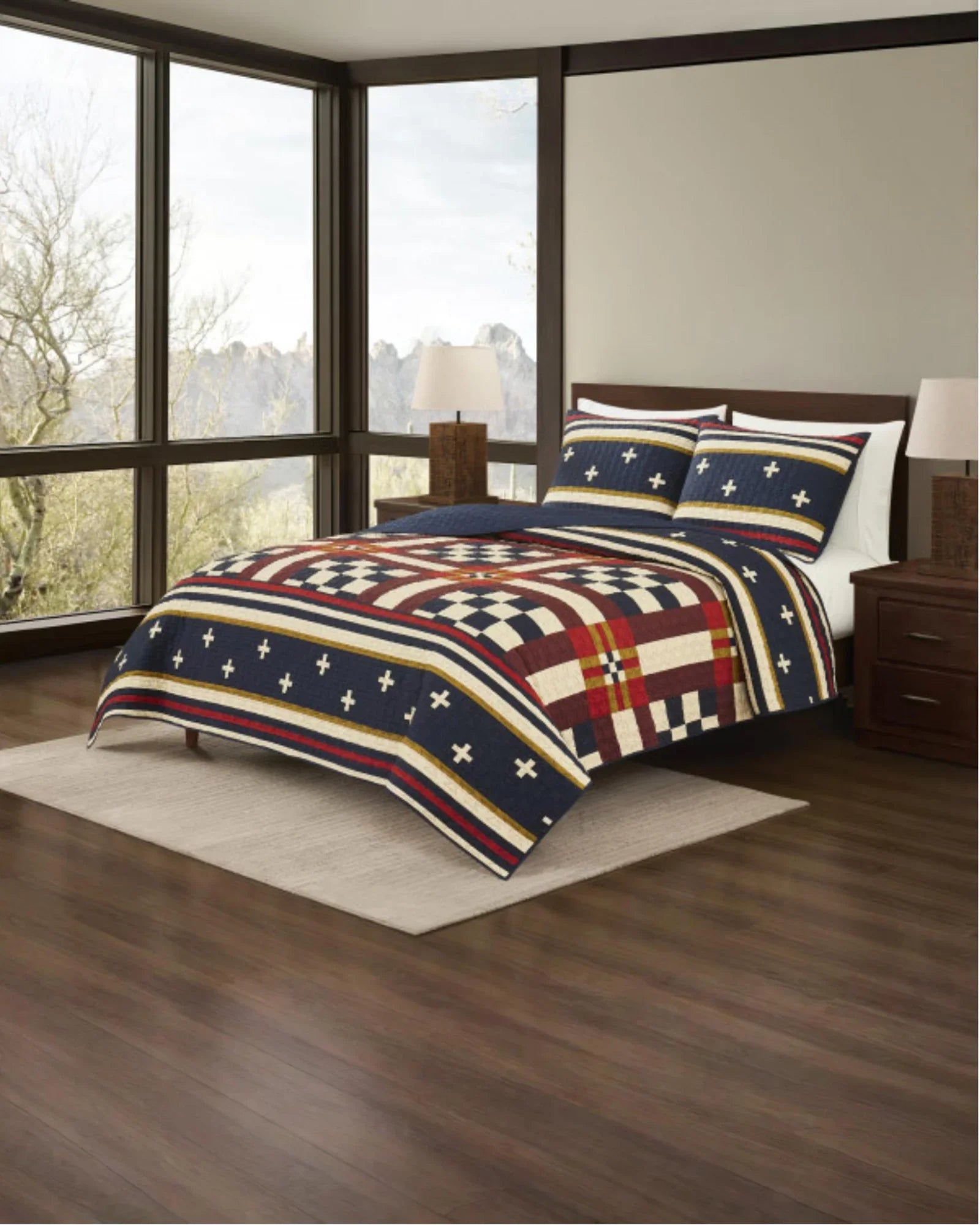 Transform your bedroom with the Scout Stripe Coverlet Set, featuring a captivating navy blue, red, off-white, and tan geometric pattern. This unique design adds a fresh, stylish touch while providing lightweight comfort. Perfect for layering or as a standalone piece, it brings warmth and personality to your bedding ensemble, making your space both inviting and visually striking. Elevate your sleep environment effortlessly with this distinctive coverlet set.