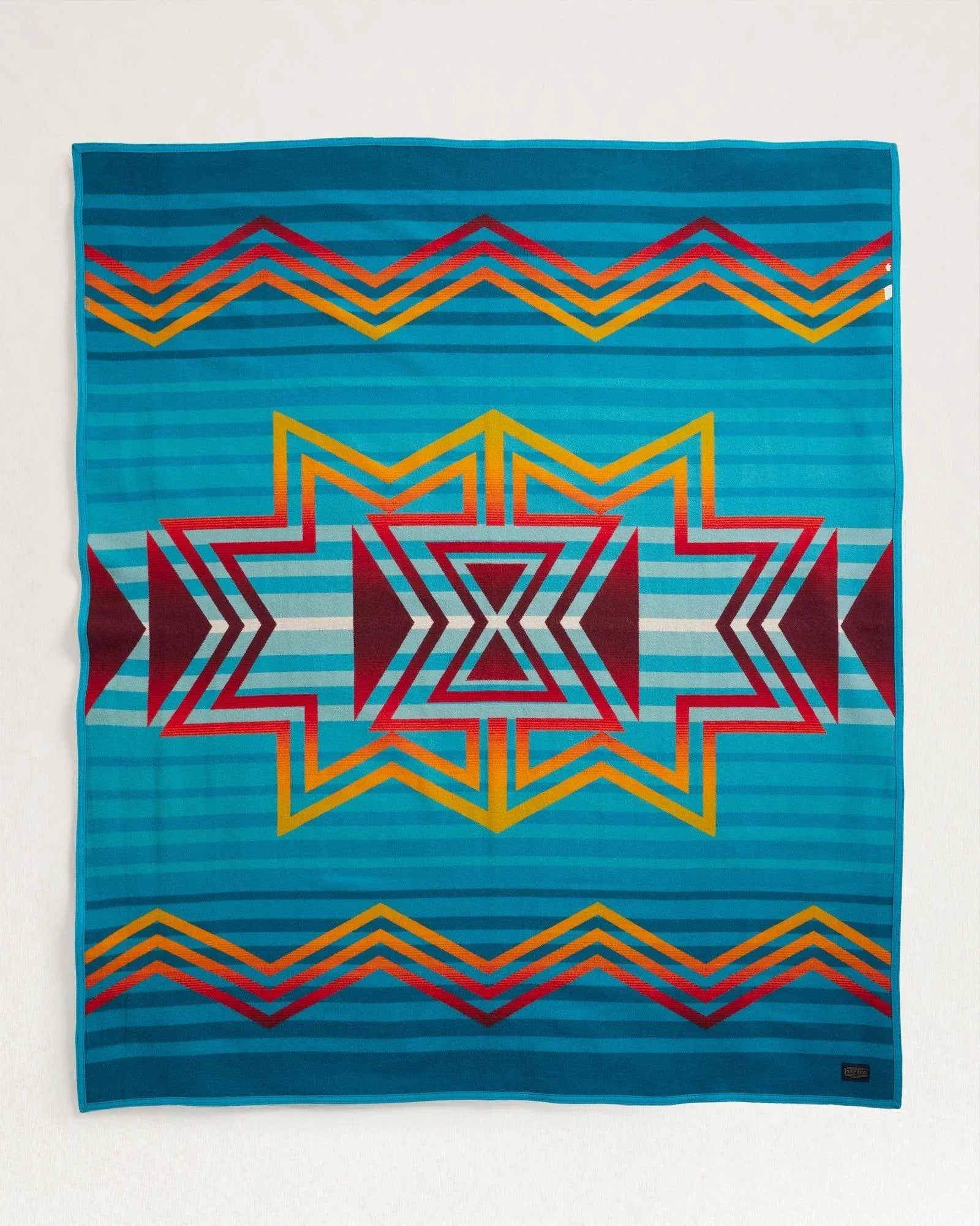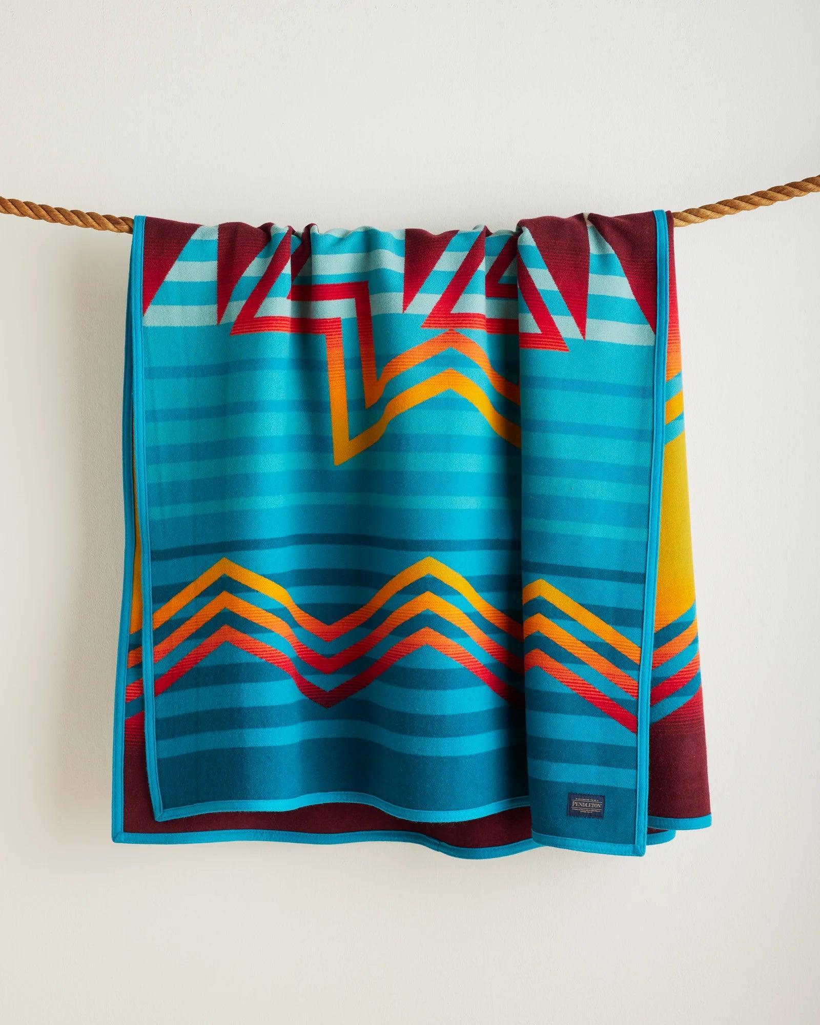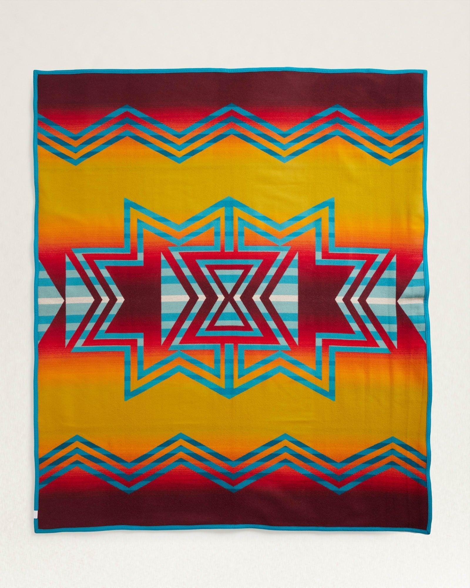 This blanket's design pays tribute to the Indigenous person representing more than one tribe. An hourglass shape evokes the matriarchal society of the Navajo, a serape layout honors the Yaqui, and turquoise symbolizes the Pueblo of Laguna—the Many Nations of the artist, Dustin Lopez. Woven from pure virgin wool in our Pendleton, Oregon, mill.