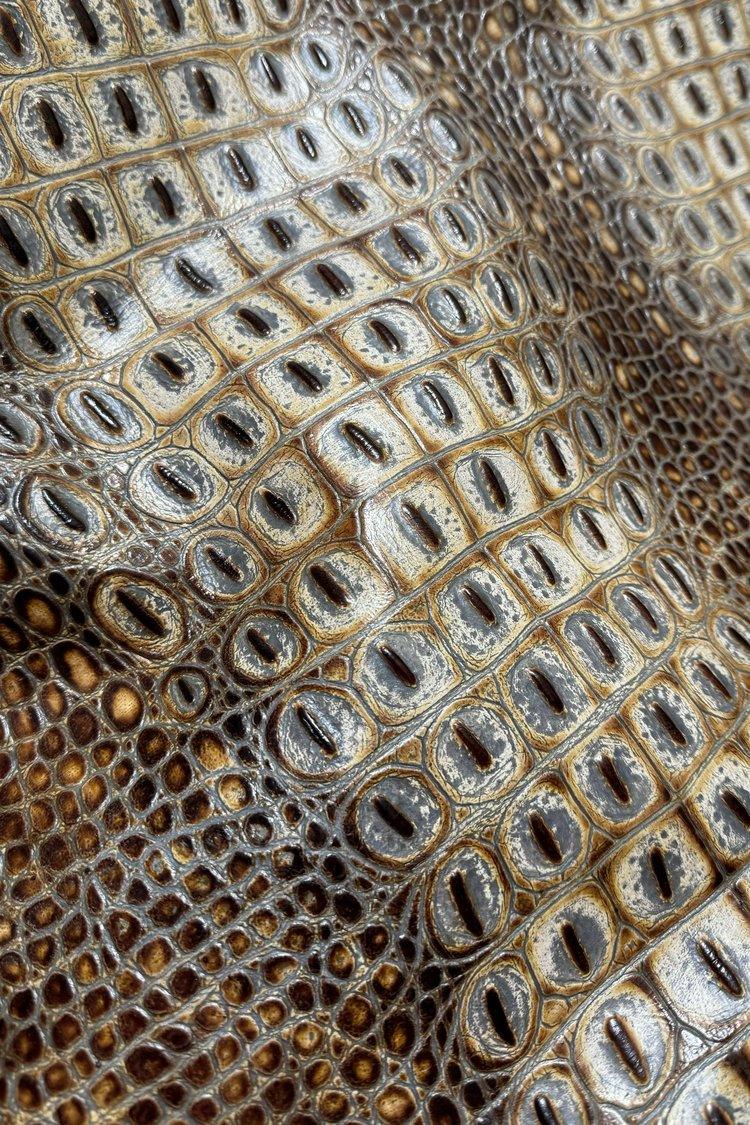 Indulge in the rustic elegance of one of our most popular reptile embossed leathers. Our Croc Dundee Embossed Leather is perfect for all your upholstery needs. This top-quality leather features a rustic blend of greys, black, beige, and sepia, adding a touch of rustic elegance to your projects. This exquisite reptile tooled leather pattern is available in both 1/2 and full hides. Don't miss the opportunity to elevate your space with this exceptional genuine leather product!