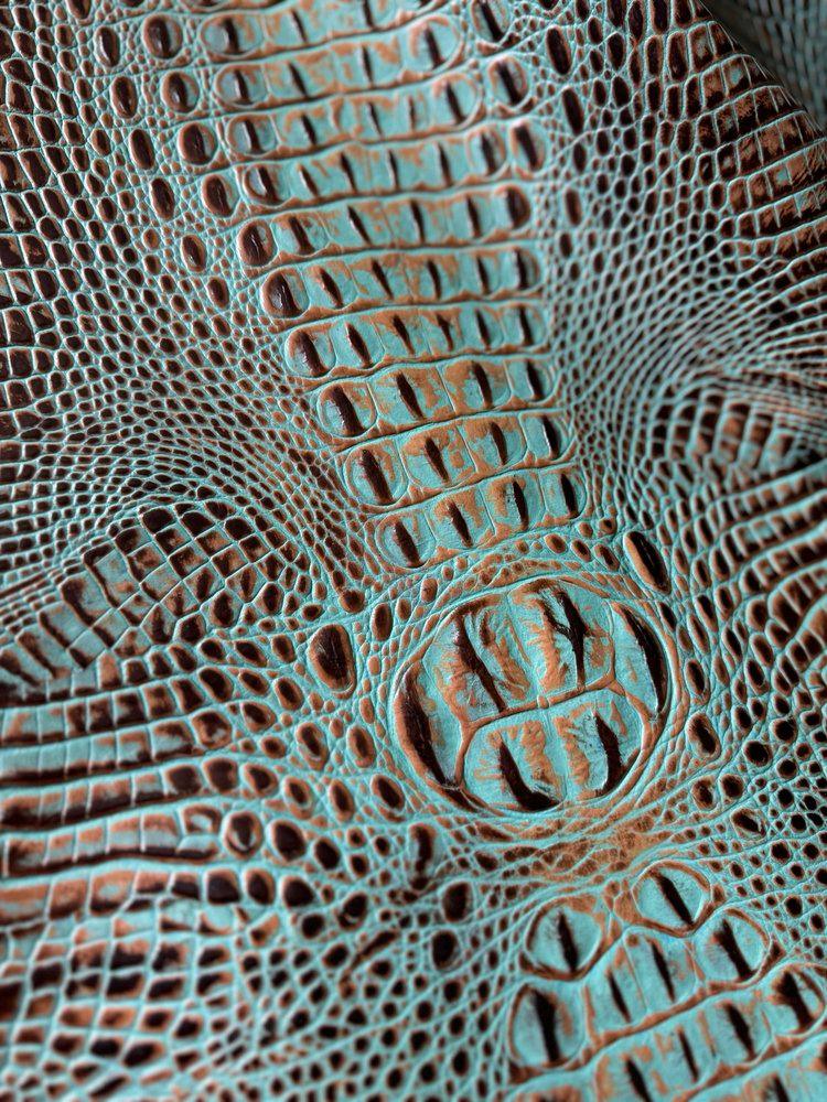 Embrace the exquisite charm of Croc Turquoise/Brown Embossed Leather. This expertly made material boasts a blend of luxurious warm browns, rich dark chocolate, and elegant aqua turquoise. Perfect for elevating the rustic aesthetic of your home decor and furnishings, this embossed leather exudes effortless sophistication.