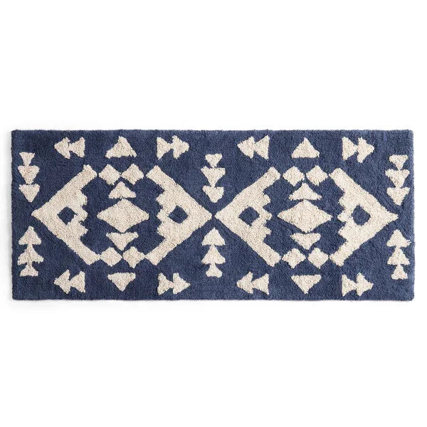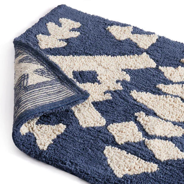 Crafted from 100% cotton, this mat boasts a loop-and-cut tufted pattern with a latex backing for added comfort. Easily machine-washable for convenience. The pattern is inspired by Diamond Peak, a slumbering shield volcano in Central Oregon. The peaks and valleys in the design echo the landscape, part of the Pacific Crest Trail.