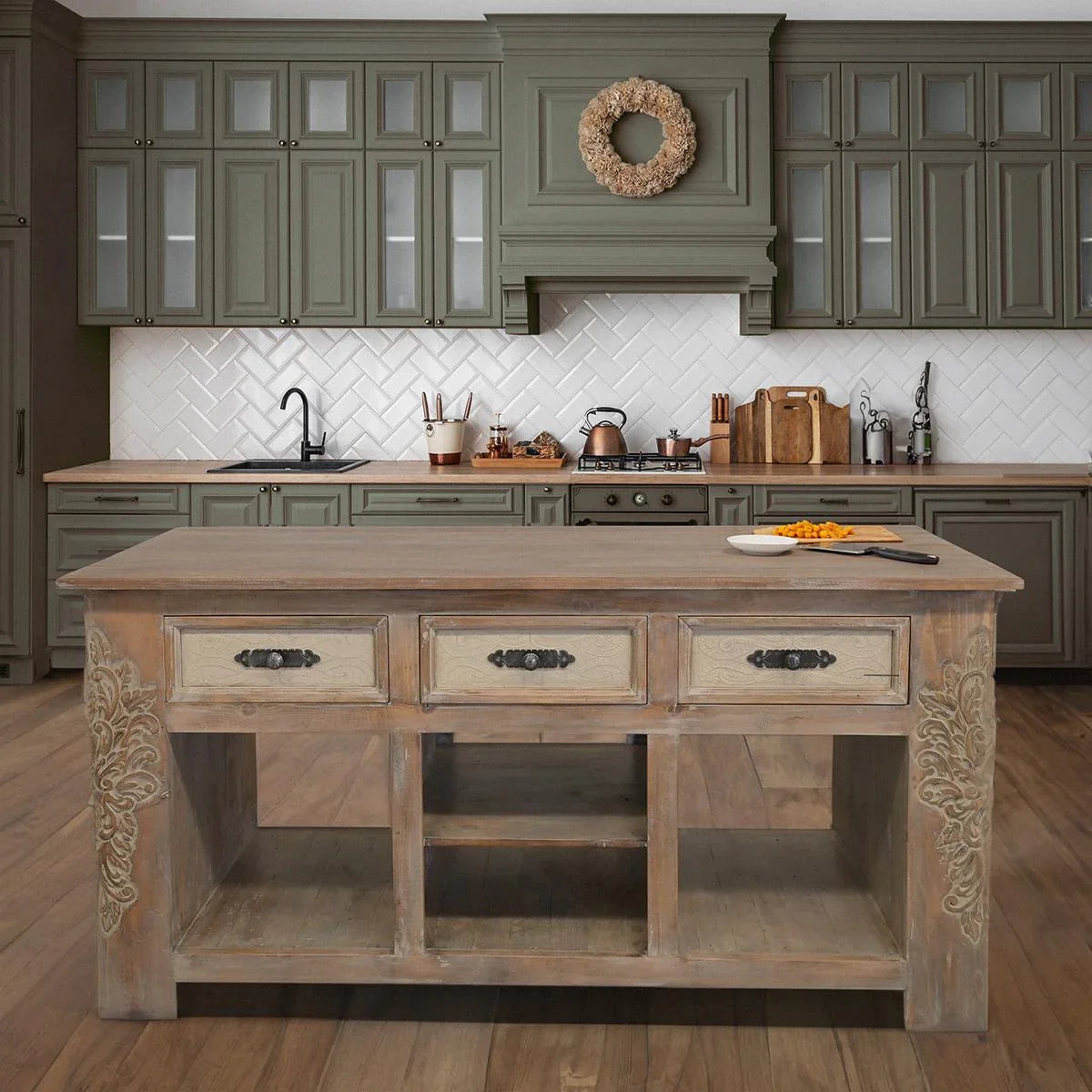 Upgrade the functionality of your kitchen with our custom-made Delaware Western Kitchen Island. Made with luxurious leather panels of your choice, this oversized island boasts 3 drawers and ample shelving for storage and versatility. It's sure to be the centerpiece of any luxury western kitchen.