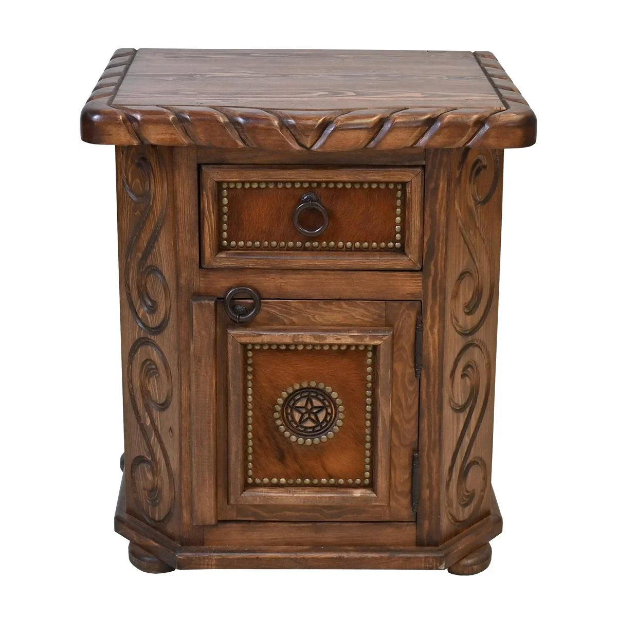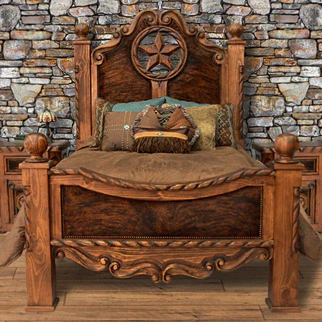 Enhance your western bedroom with our Lonestar Cowhide Bedroom Furniture. This set showcases brindle cowhide and beautiful hand-carved designs such as rope, Texas star, and other intricate details. If you're searching for a perfect match, take a look at our extensive cowhide collection for a charming, rustic touch to your living space.