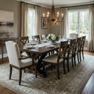 The Telluride Ranch Table is a masterpiece of craftsmanship, made from solid knotty alder with a satin-smooth top and hand-hewn edges that highlight its natural character. Featuring a rich dark walnut stain and a rustic trestle base, this durable dining table comfortably seats ten, making it ideal for elegant gatherings. Handcrafted in Weldona, Colorado, it brings refined rustic charm and lasting quality to any dining space.