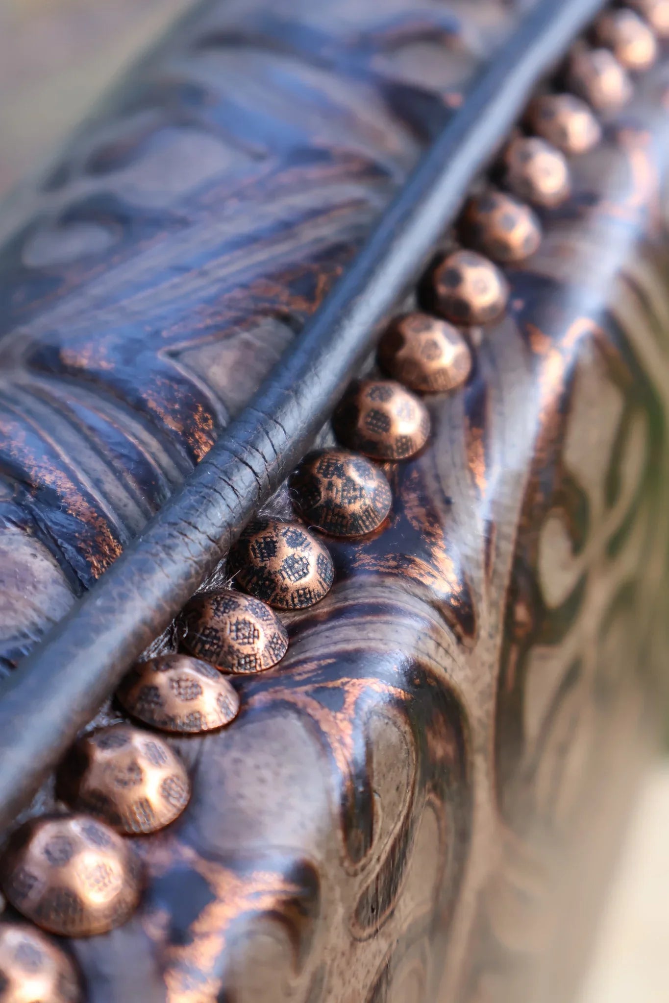 This accent leather is embossed with an organic, bark-inspired pattern, then layered with multiple hand-applied color coats. The process creates rich contrast, depth, and an antique finish, completed with a protective lacquer topcoat that enhances warmth and longevity.
