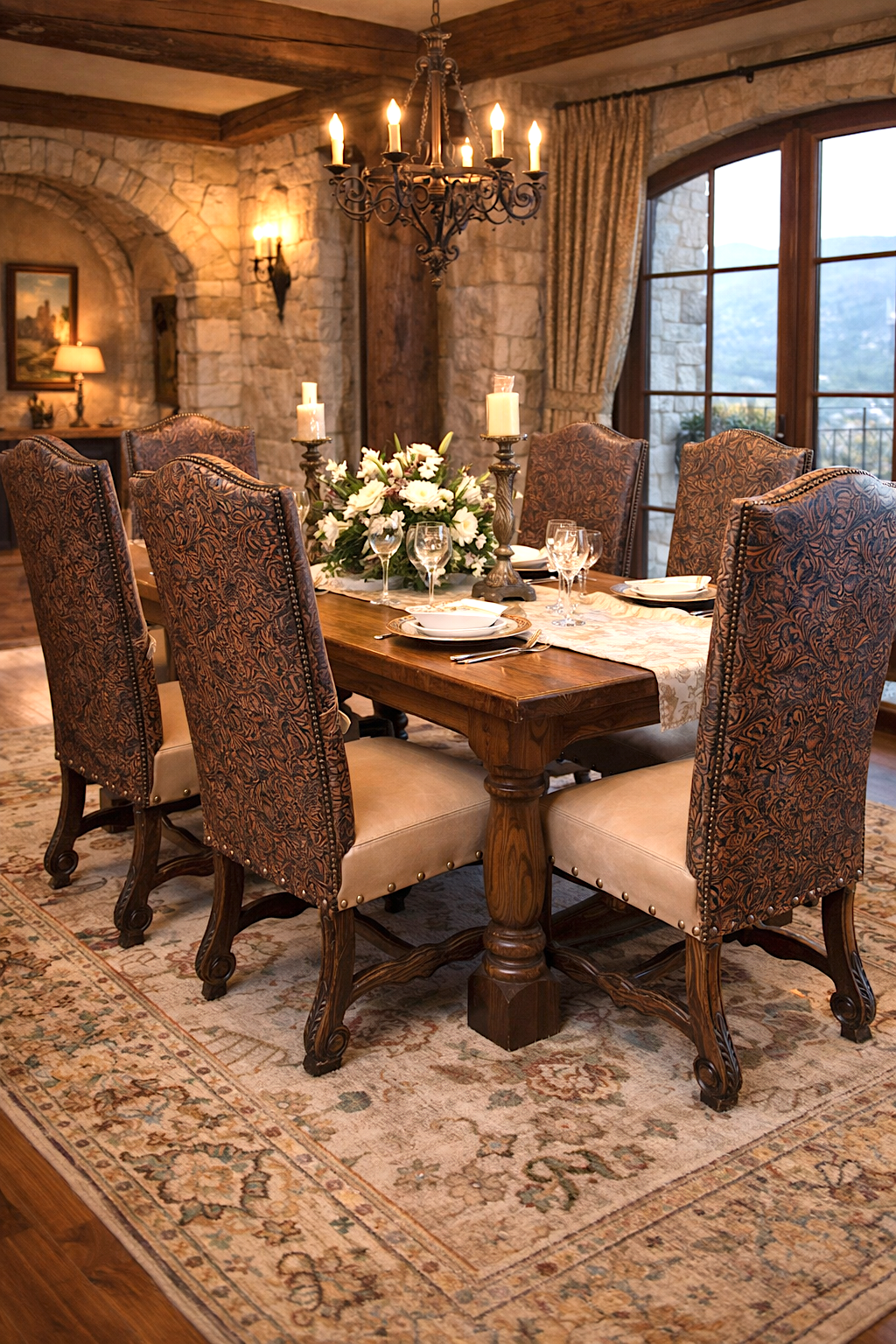 Designed to anchor the dining room with warmth and sophistication, the Timberlake Leather Dining Chair blends Old World craftsmanship with timeless rustic elegance. Its tall, sculpted back and artisan leather detailing create a striking presence at the table while delivering exceptional comfort for long, relaxed gatherings.