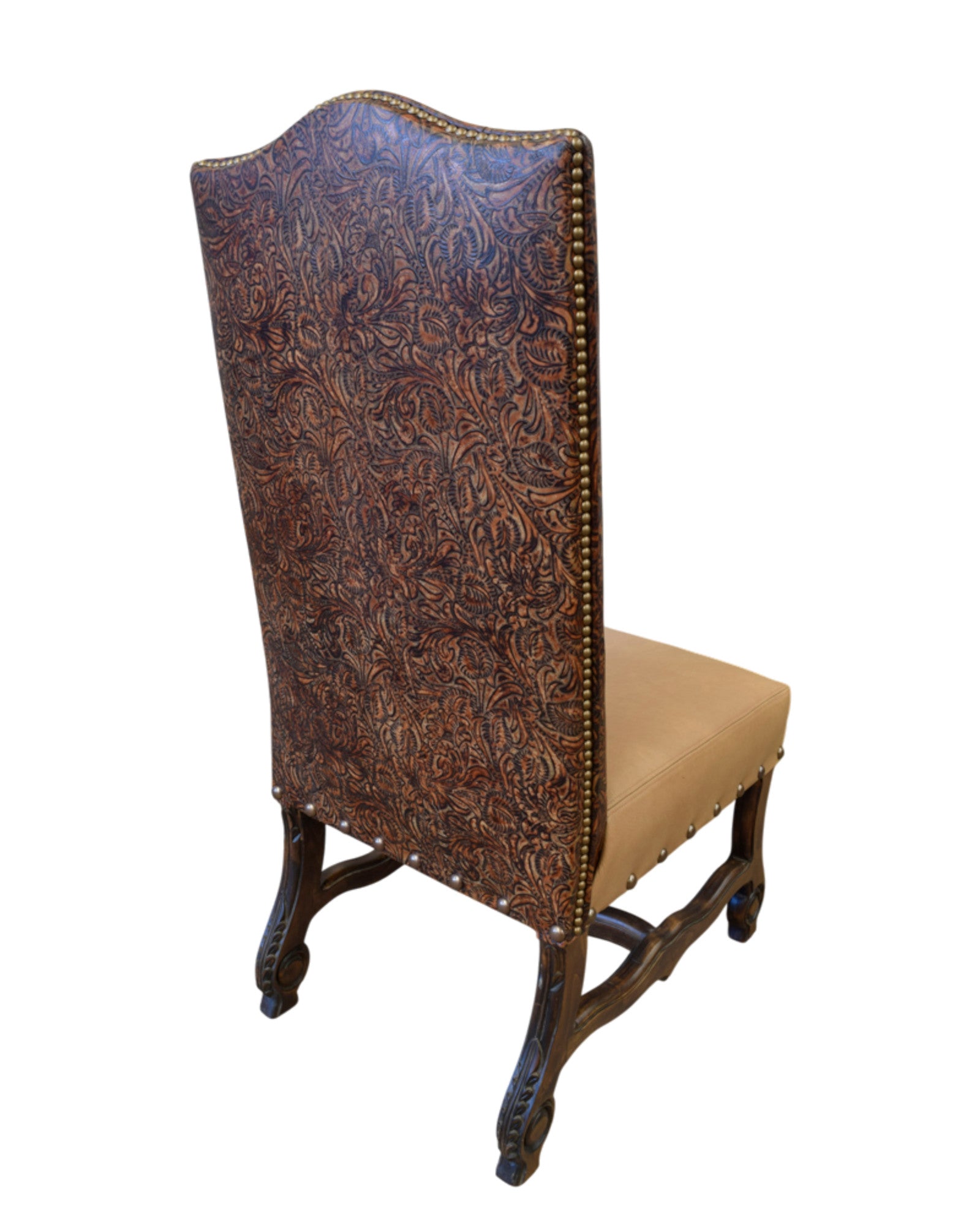 Upholstered in 100% genuine top-grain leathers, this chair features a smooth, distressed leather seat paired with a richly embossed leather back, showcasing depth, texture, and handcrafted character. The combination of materials adds visual interest while remaining neutral enough to complement a wide range of rustic, lodge, and refined Western interiors.