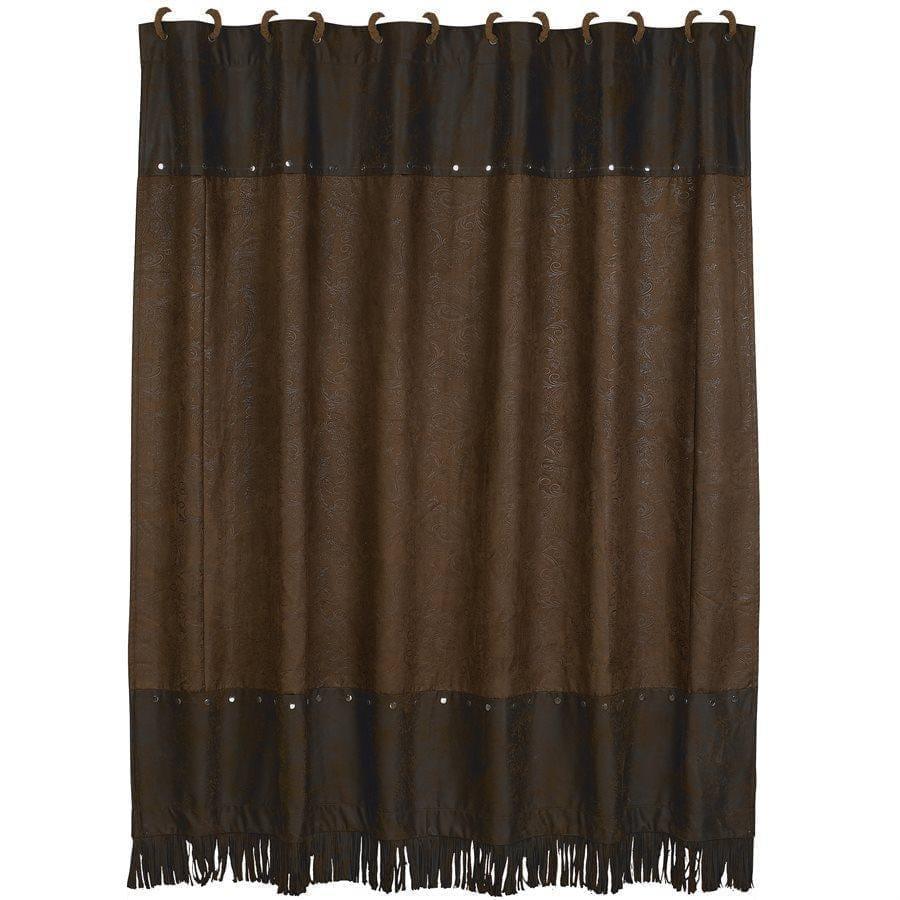Lovely faux tooled leather shower curtain features faux leather fringe and silver studs. A great piece for any western or lodge themed bathroom. Studs are embedded into the fabric for durability, not glued. Includes 12 coordinating fabric covered shower curtain rings. Imported.