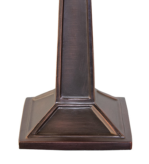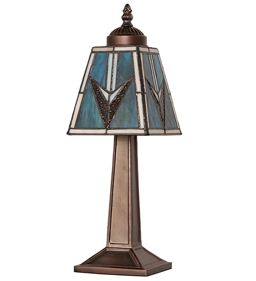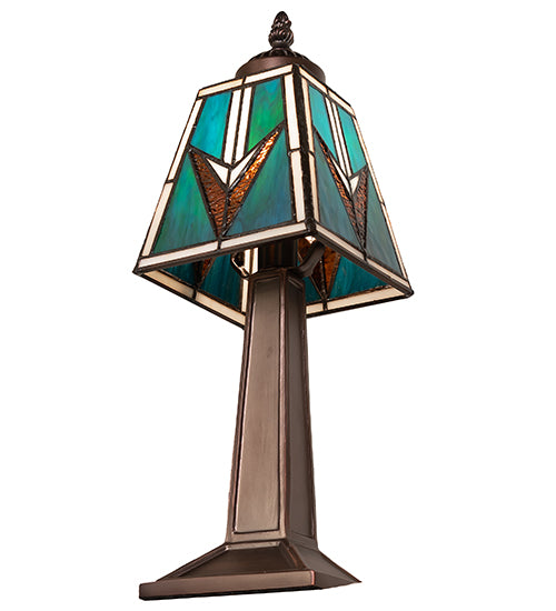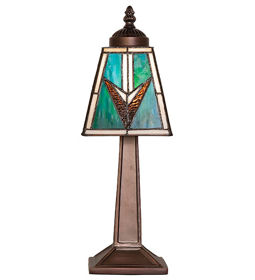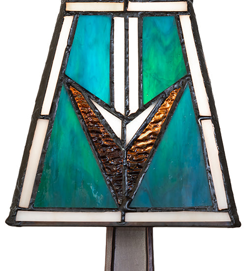 - Handcrafted stained glass shade with geometric Mission-style design