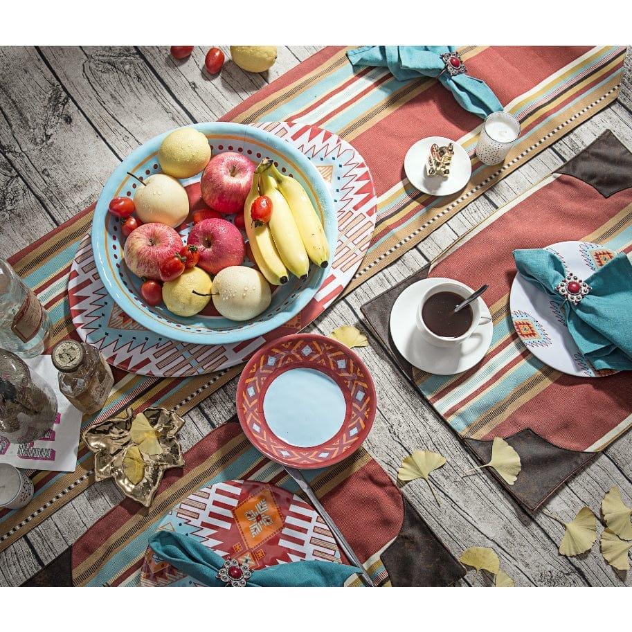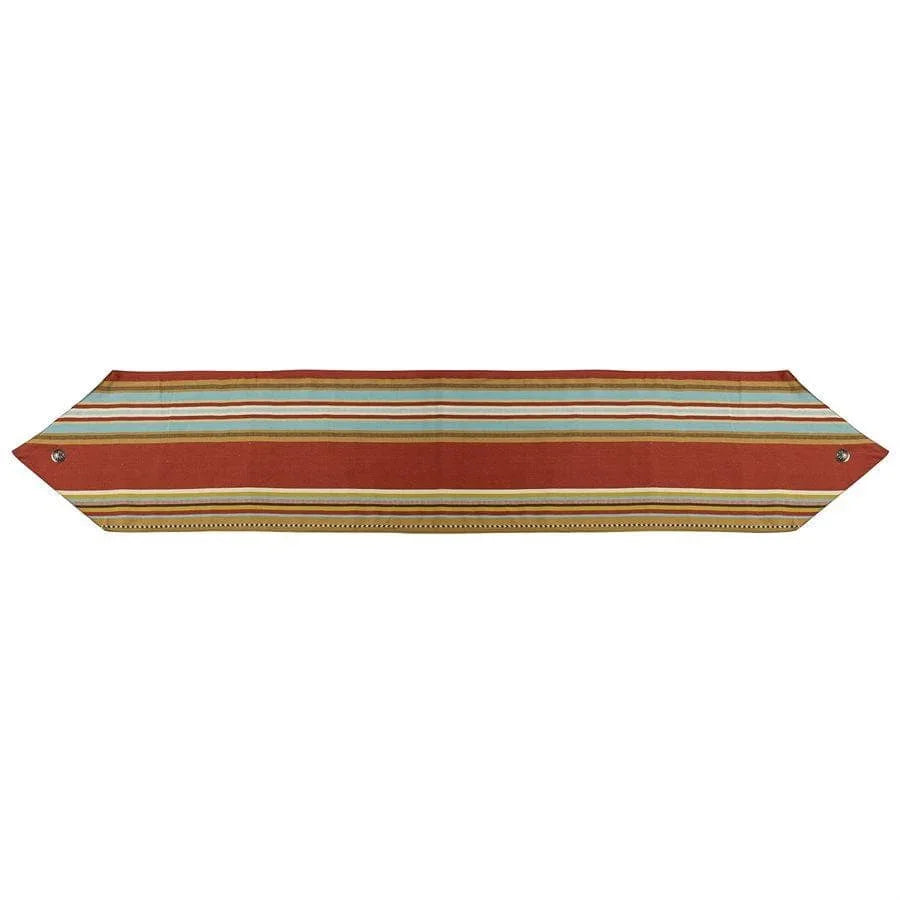 The Calhoun table runner showcases vibrant serape-inspired stripes of rich red, soft taupe, chocolate and turquoise to add color to your table. Finished at both ends to a point, silver Conchos provide the finishing touch. Consider combining with the Calhoun placemats and the Savannah dinnerware set for a truly stunning presentation. Imported.