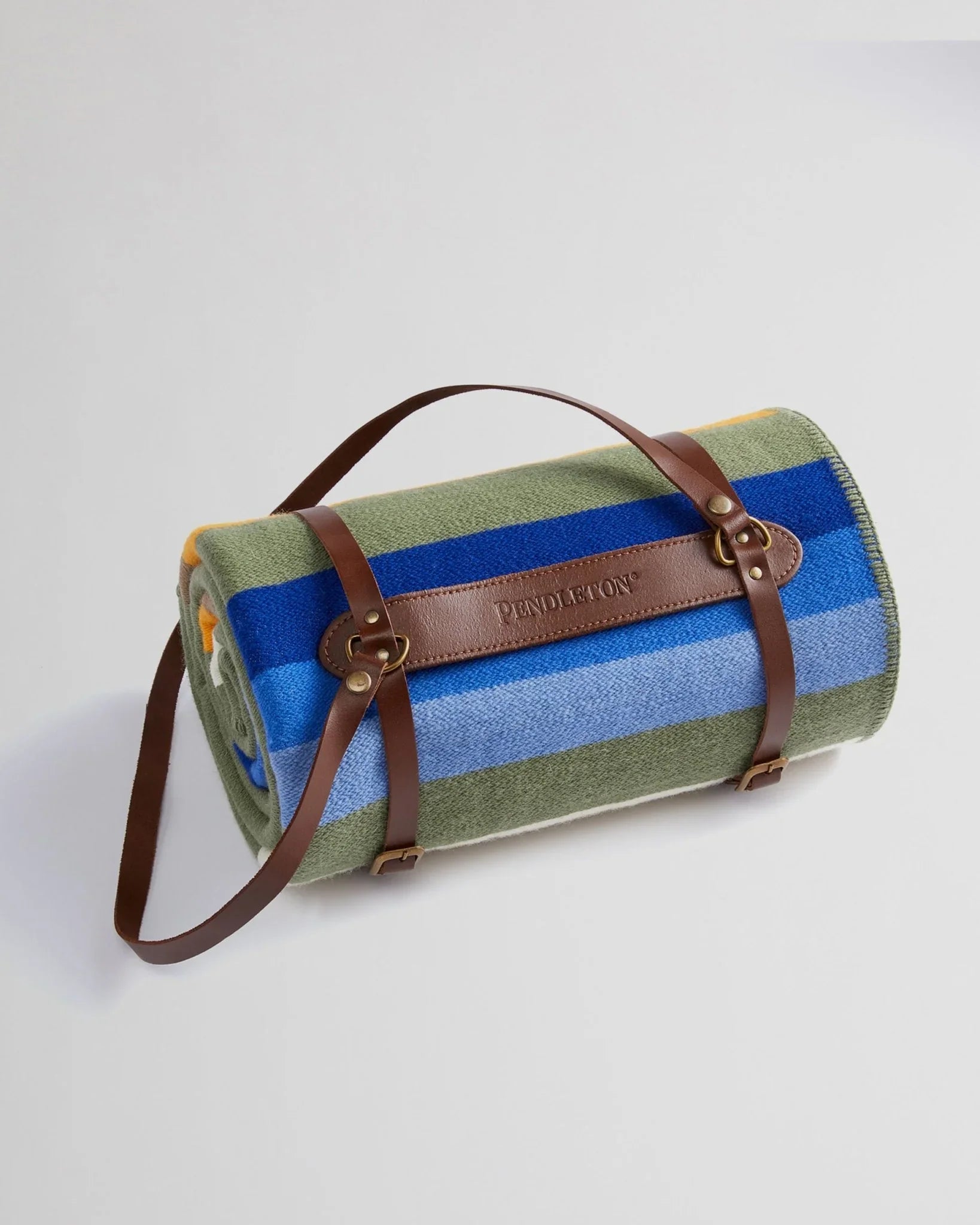 Experience the cozy comfort of the Rocky Mountain National Park Throw Blanket - now in a compact size perfect for couches or beds. This wool blanket is the perfect companion for any adventure, whether it's a road trip, picnic, or outdoor concert. And with its convenient leather carrier, you can easily bring it wherever you go.