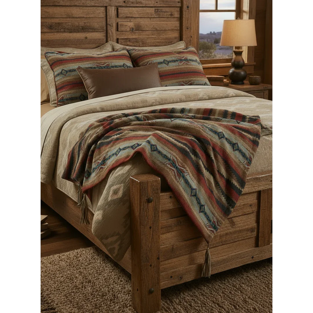 Embrace the serene spirit of the desert with the Sunset Canyon Throw, inspired by the subtle yet striking hues of the Southwest. This throw showcases a perfect mix of gentle sage greens, deep rust tones, warm browns, and hints of soft blue, reflecting stunning desert sunsets. Made from 100% Acrylic fabric on the front, it ensures brilliant color, long-lasting strength, and resistance to fading. Finished with genuine leather fringe, it adds a handcrafted detail that enhances its authentic Southwestern appeal.