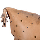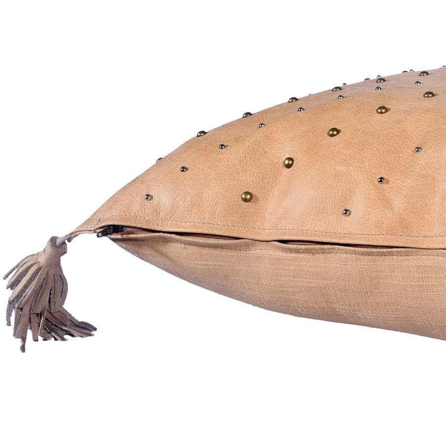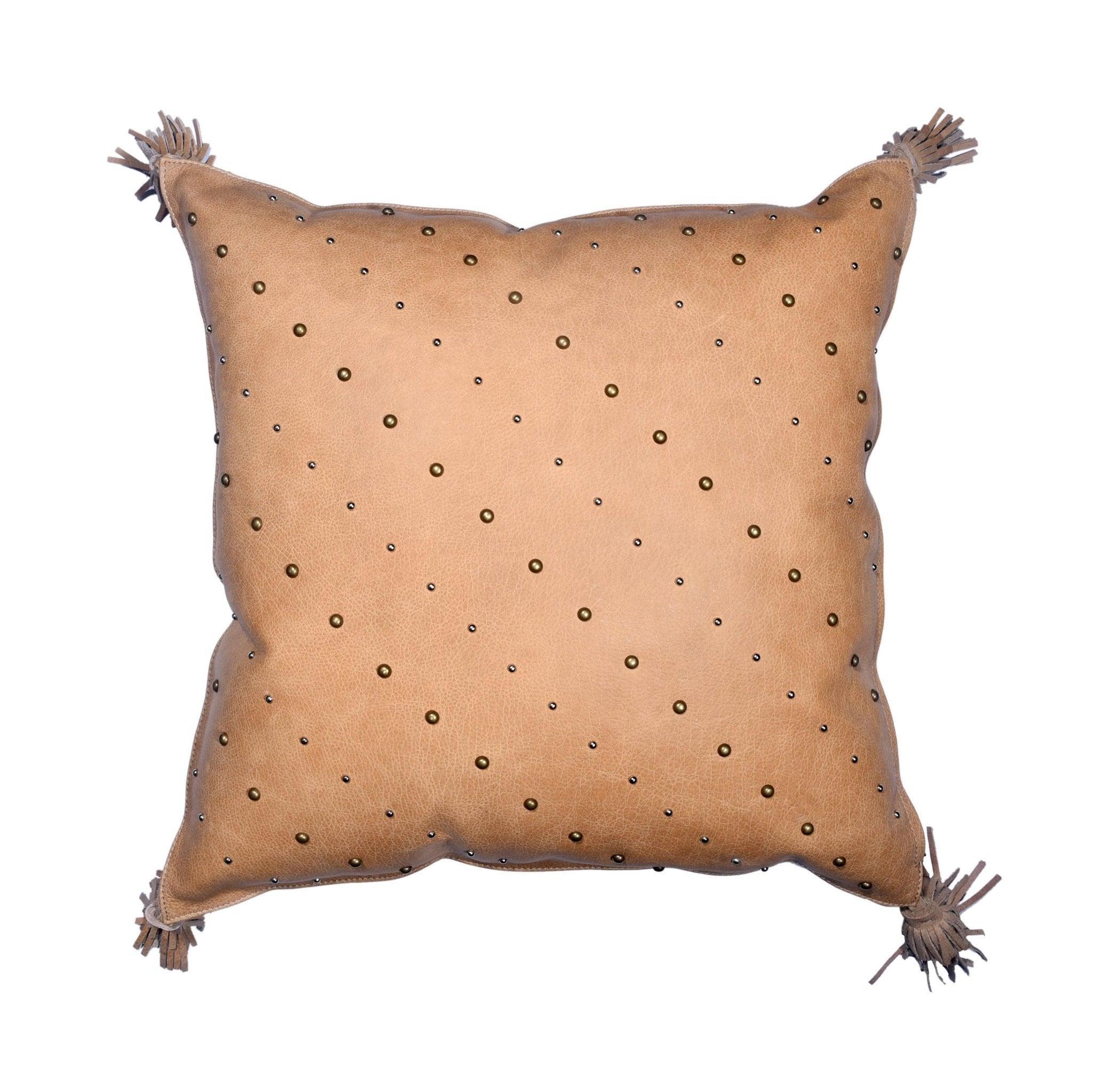 Our genuine leather pillows instantly add that extra chic element to throw any bed set over the edge. This option comes oversized, 20x20, made from a light English tan colored hide, and is embellished with tiered leather tassels and diagonal stripes of alternating studs, perfect for a Western aesthetic. Imported.