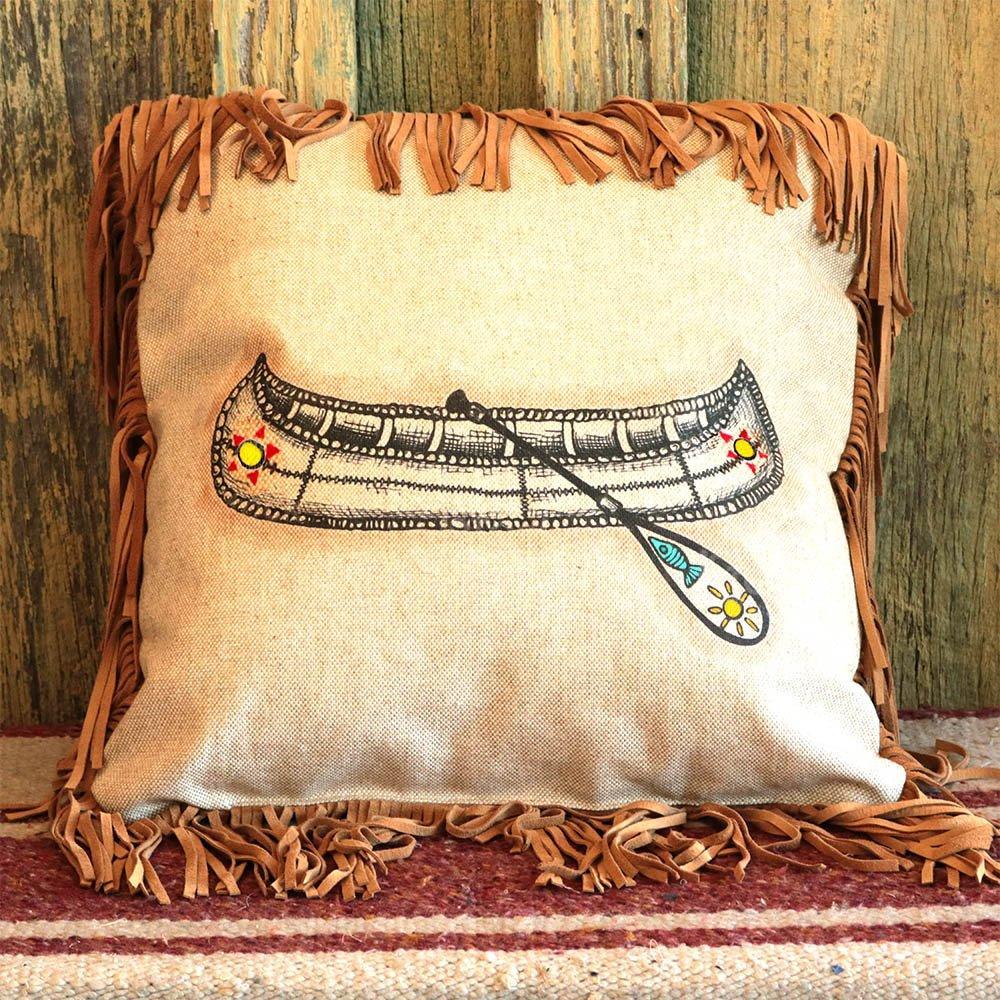 The colorful symbols on our Canoe Leather Pillow tells the wonderful story of early American Indians in the north country who made canoes with birch bark that was perfect because it was light weight, durable and waterproof. Canoes were ideal for travelling long distances in the streams, rivers and lakes of North America. The canoe allowed Native Americans to become an important link in commerce, as the fur trade exploded in America in the early 1700’s.
