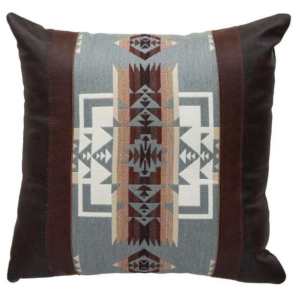 The Chief Joseph Fabric and Leather Throw Pillow showcases the stunning Chief Joseph fabric in the center and genuine leather sides. This beloved design can be found in the Pendleton collection, encompassing bath towels, bedding, and throws. With its versatile uses in upholstery and home decor, this fabric truly ties together any living space.
