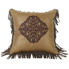 This Las Cruces decorative toss pillow features a beautifully embroidered black damask motif on faux tan leather, accented with fringe.