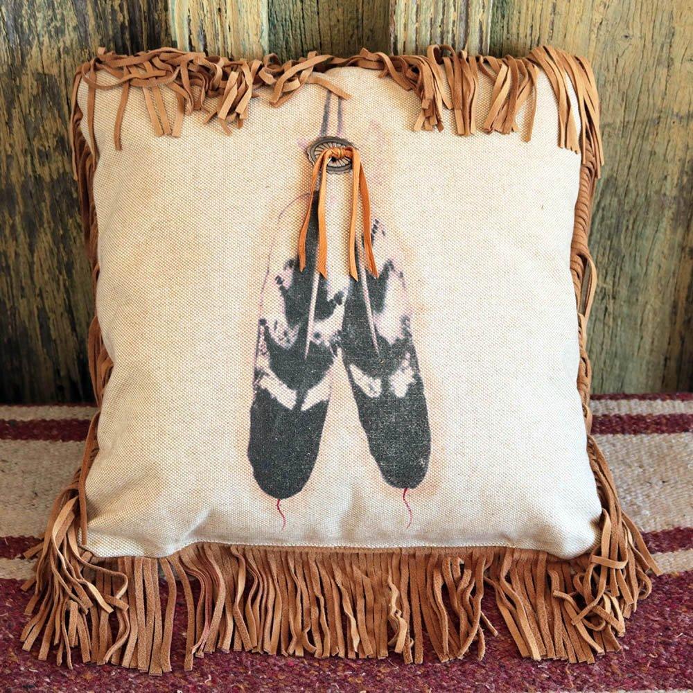 Our Two Feathers Throw Pillow features hand painted giclee details with an antiqued silver concho tied on with deer skin tassels. Eagle and turkey feathers were used often by Native Americans for decoration and making arrows.