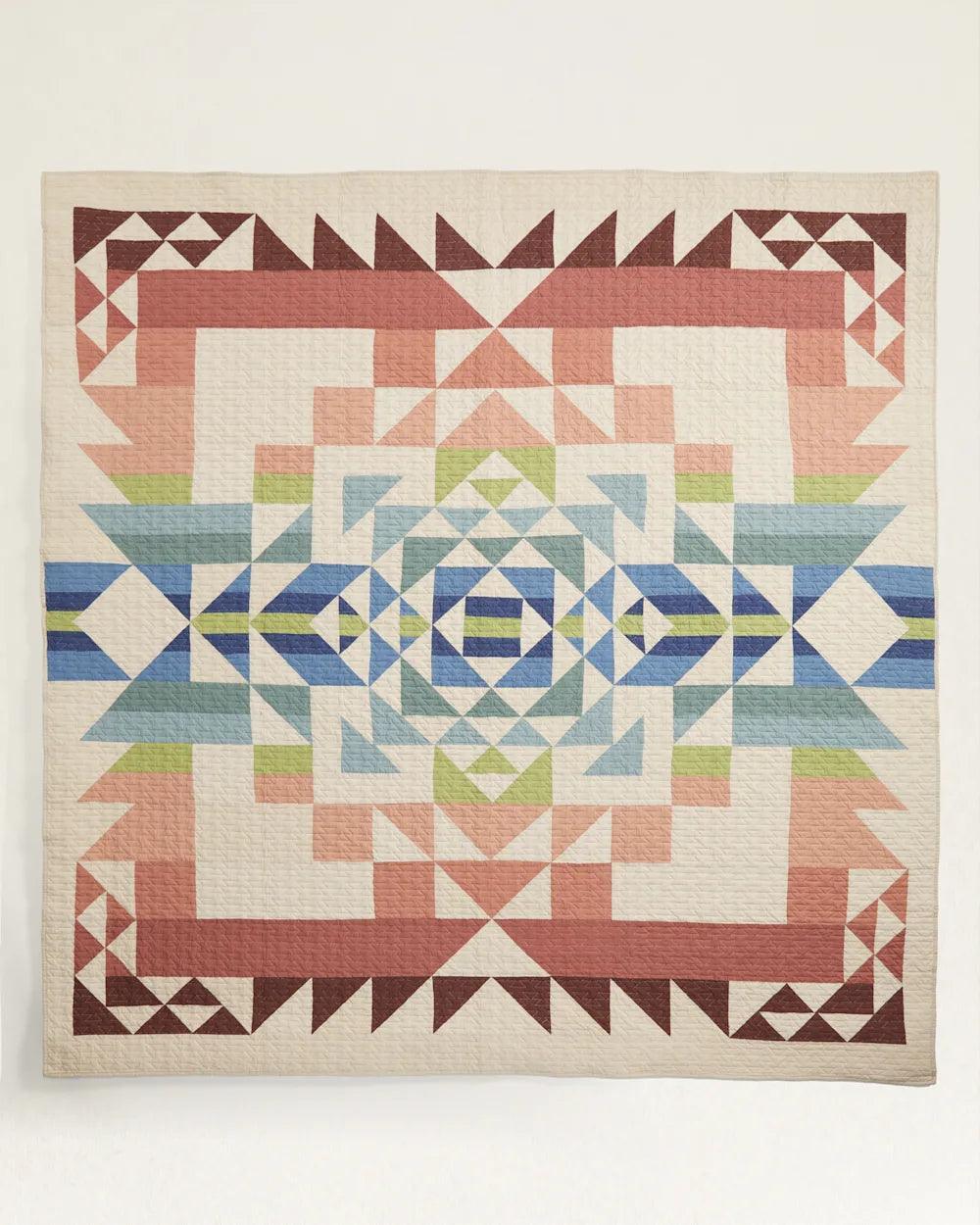 Upgrade your bedding with this beloved Pendleton pattern now available in an effortless, cotton coverlet that can be easily washed. It's colorfast and machine washable, making it ideal for households with children or pets. The Twin size includes one standard sham, while the Full/Queen size has two. The King size comes with two king shams. The quilt features a solid reverse and a lightweight, breathable cotton fill.