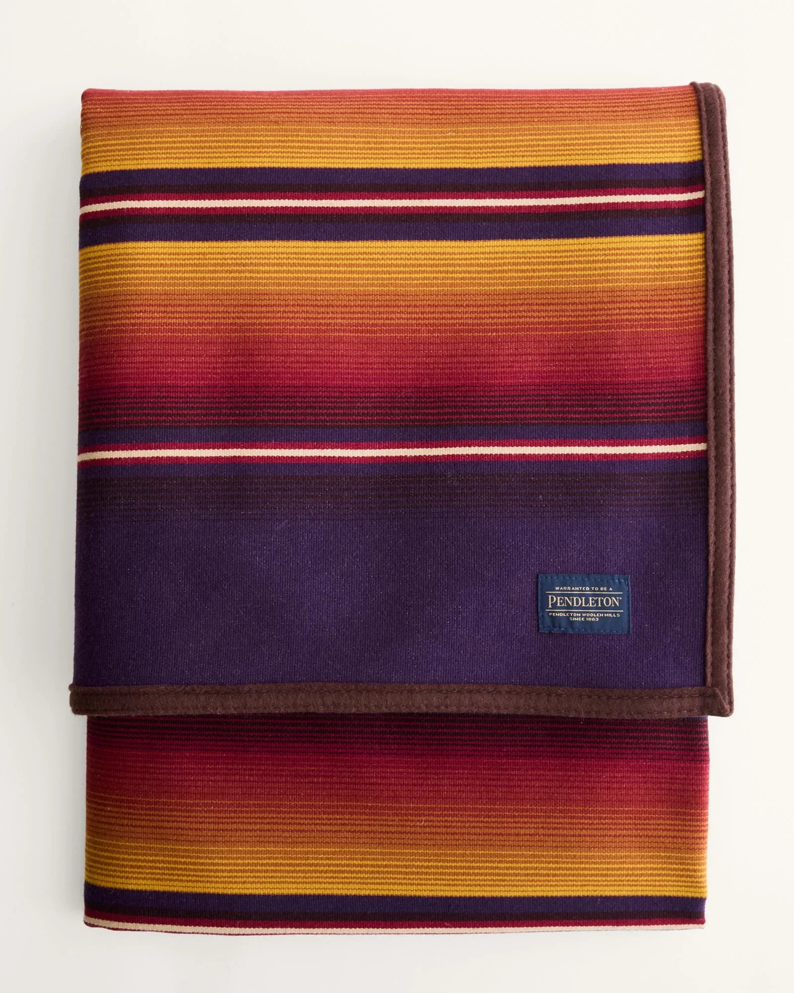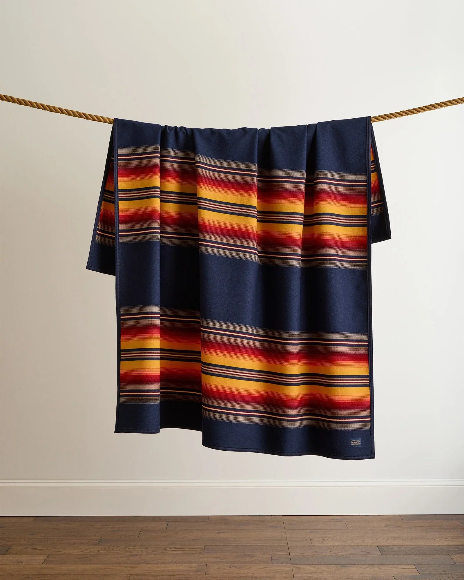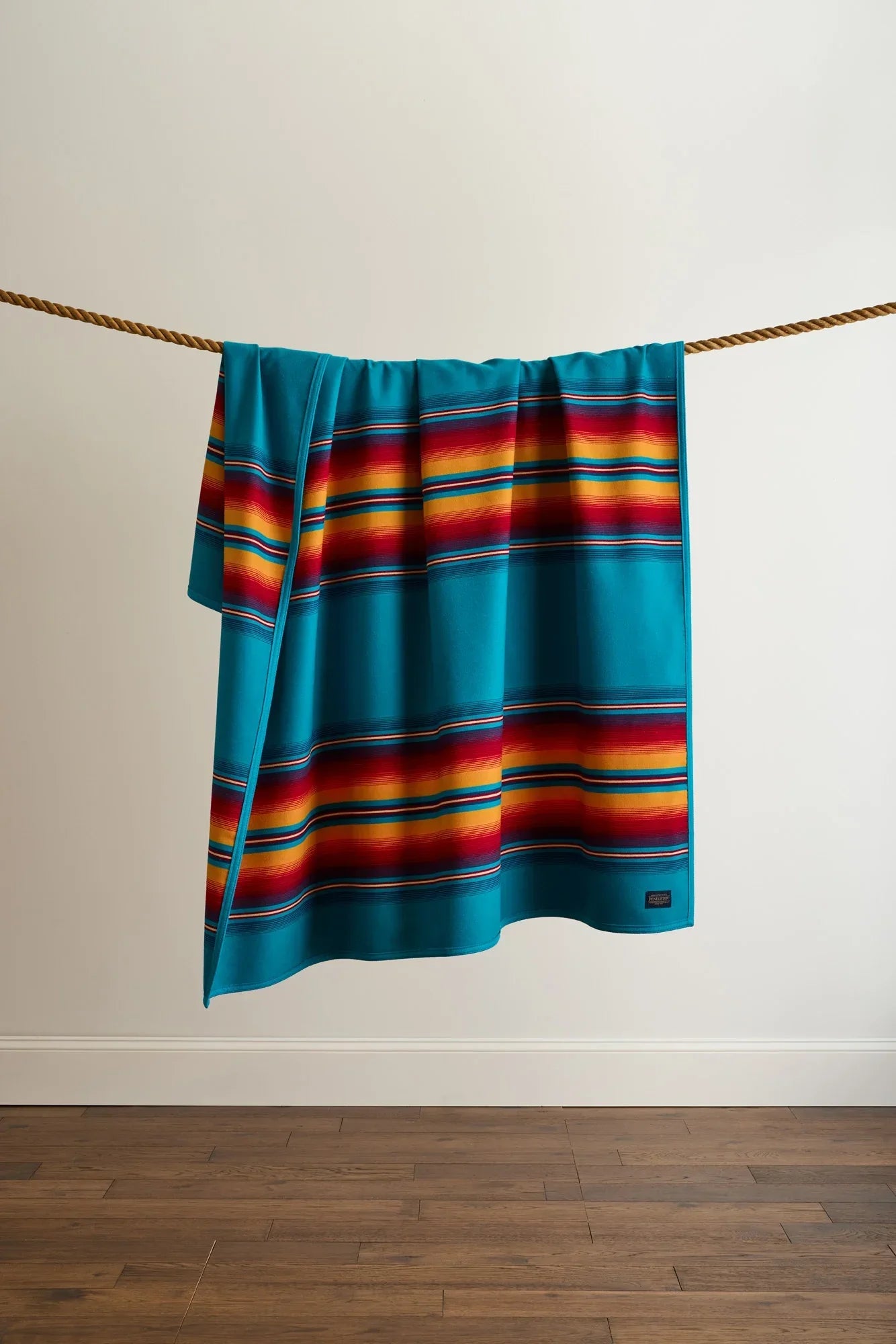 Transformed by skilled artisans, wool possesses a unique ability to absorb dye, resulting in a lasting and vivid hue that will delight for many years. Drawing inspiration from the renowned serape designs of Saltillo, Mexico, these dynamic and lively stripes are meticulously crafted in Pendleton's mills in the Pacific Northwest. Their lightweight construction makes them perfect for the changing seasons of late summer and early fall.