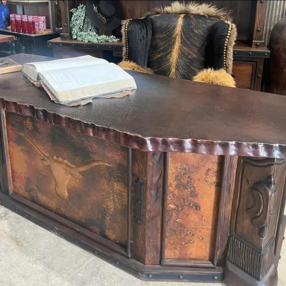 Uncover the unparalleled rustic elegance and artistry of our Carved Copper Panel & Cowhide Desk. The impeccable corner detailing, evocative of hooves, commands attention to the intricate craftsmanship and handiwork that distinguishes this desk. Adorned with iron trim and padded panels adorned in genuine hair on hide, it embodies a charming rustic allure. The center copper panel is the attention grabber on this western desk, featuring a large embossed center Longhorn steer. The writing surface showcases breathtaking hand-forged rivers of color and design that blend harmoniously, infusing a touch of sophistication into this exclusive western desk.