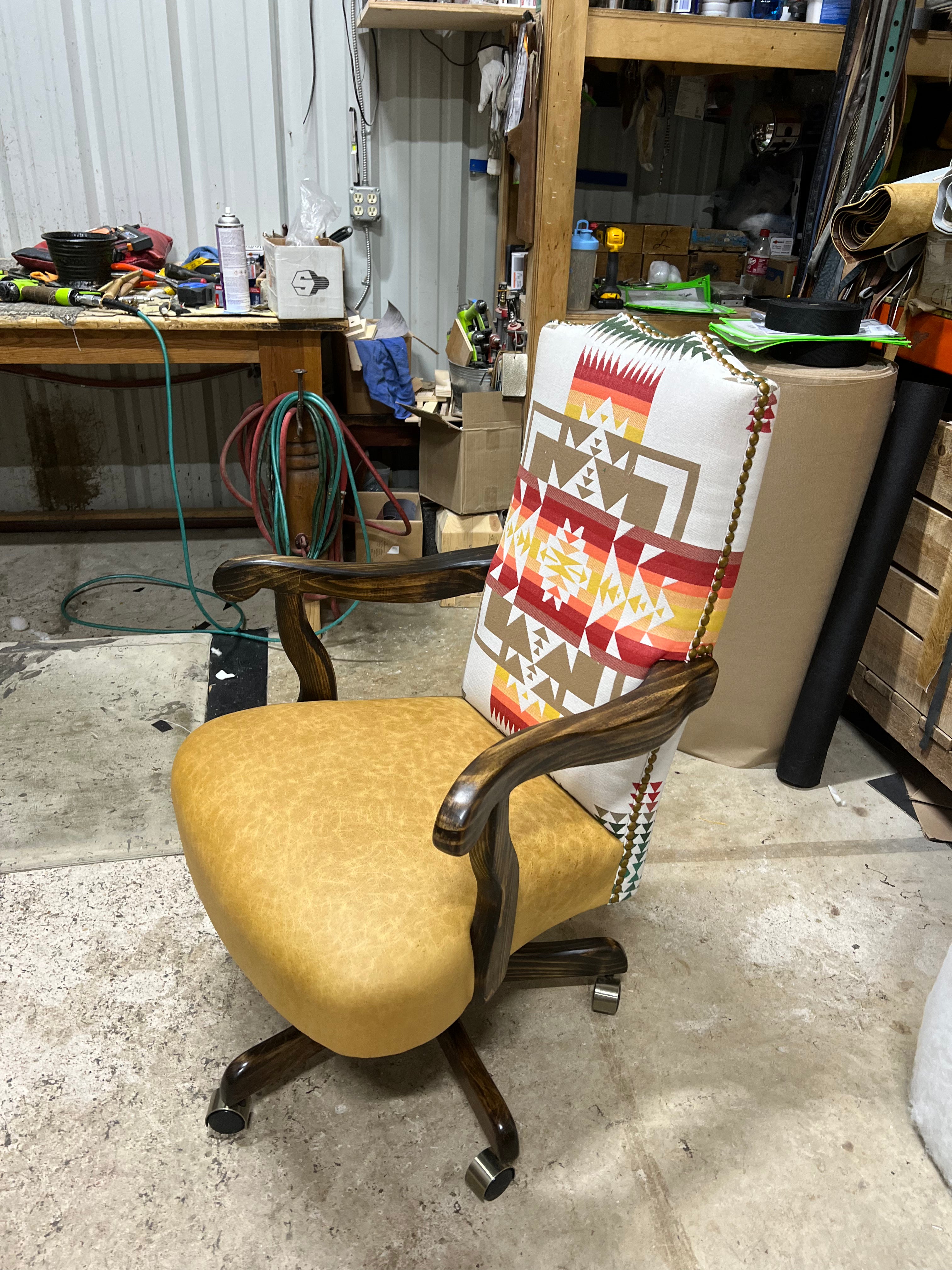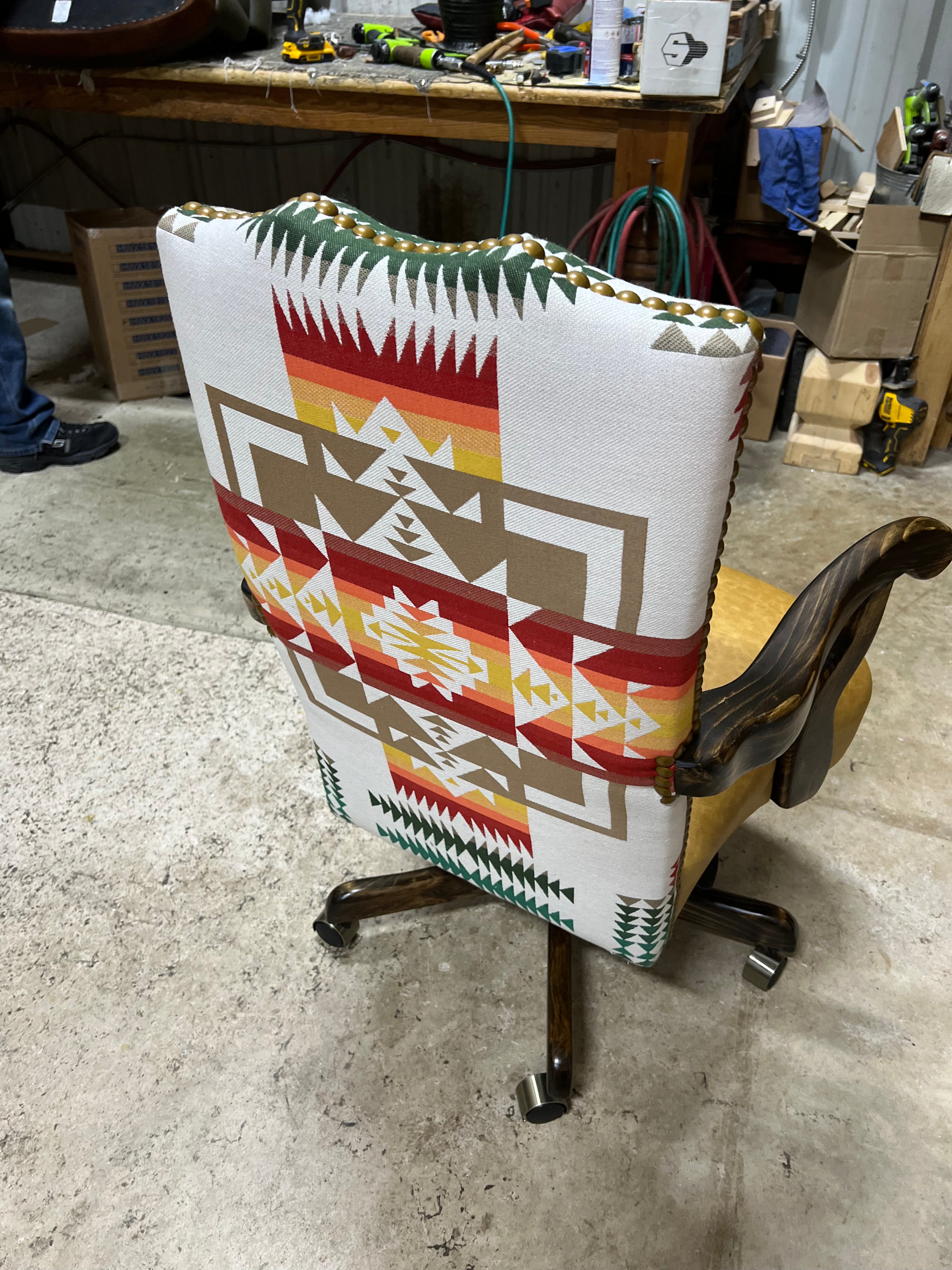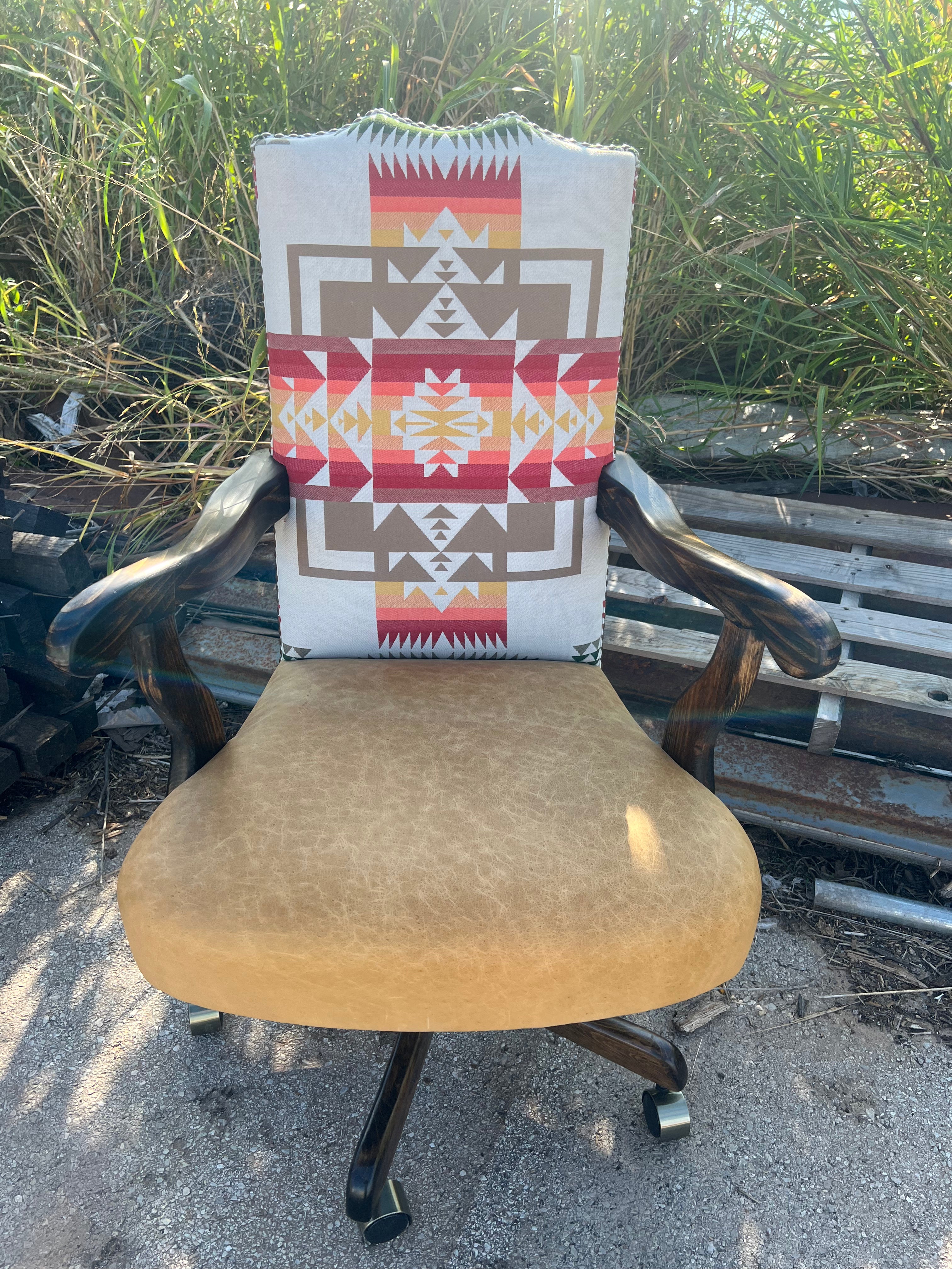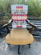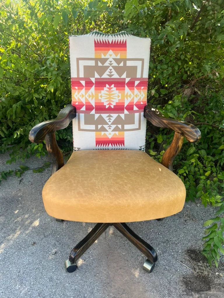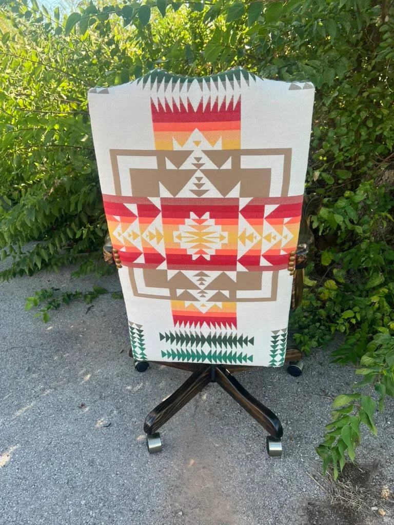 Elevate your workspace with the exceptional and practical addition of our customized Chief Joseph & Leather Office Chair. Perfect for a southwestern-style office seeking refinement, our rotating office chair exudes an elegant charm with its lavish fabric crafted from Pendleton Sunbrella Chief Joseph material and sleek buckskin leather. The strategically placed nailhead trim adds a touch of sophistication. Indulge in the luxurious Southwestern office chair and be inspired by its unique design. The sturdy Pine wood frame is coated with a rich dark chocolate wax and lacquered for unmatched durability and sophistication.