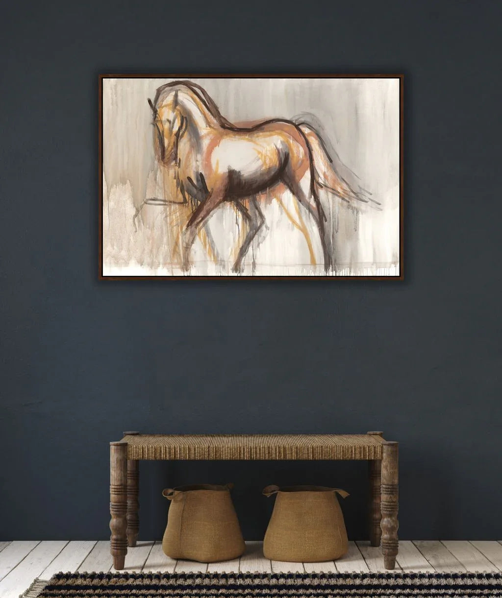 The Dance - Canvas Horse Art is a compelling horizontal creation that seamlessly merges traditional and sophisticated ranch aesthetics. This piece, which depicts a horse in a thought-provoking manner, can be displayed in a multitude of settings, making it a perfect addition to a living room, bedroom, or office. Framed in sleek black, The Dance adds a touch of refined elegance and emotional depth to your home decor. With intricate brushstrokes and natural hues, it exudes a sense of graceful movement and depth, elevating the atmosphere of any room with its timeless sophistication and exceptional artistry.