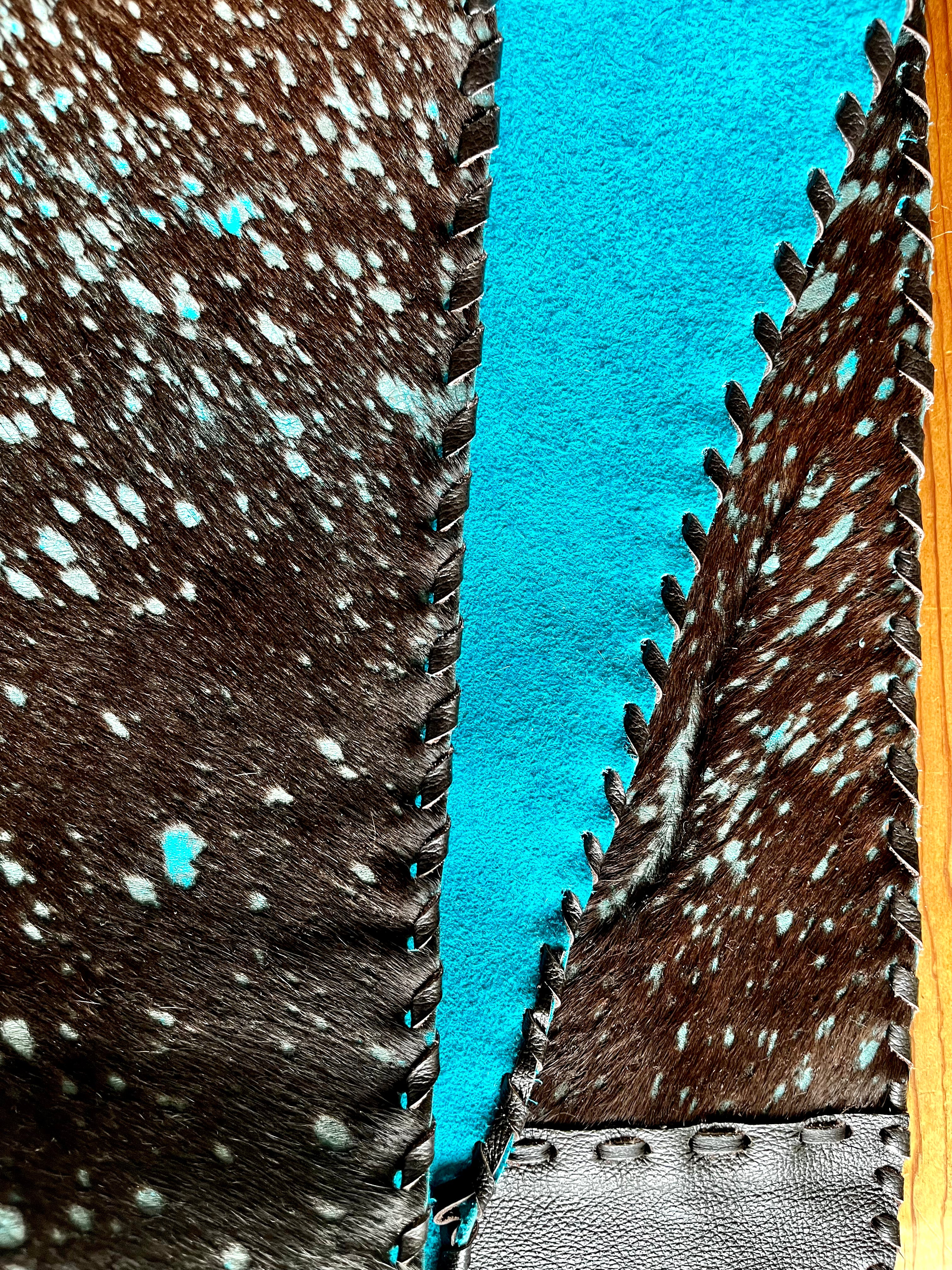 This stunning table runner is acid washed metallic turquoise over black and white cowhide, leather accents in black and turquoise in the center and on each end, horse shoe conchos and a finishing touch of whip stitching and tassels!