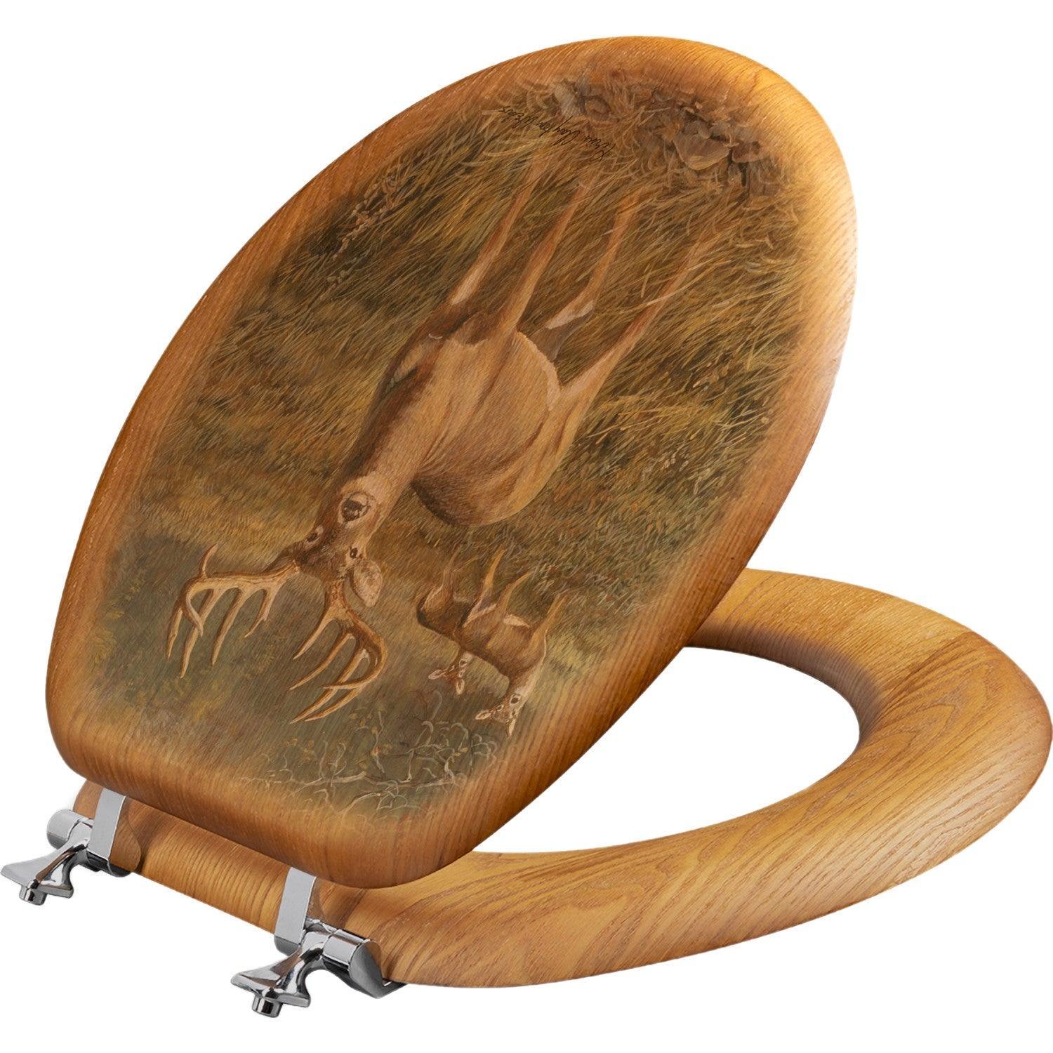 With the Alert Whitetail Buck Art Toilet Seat, you'll add a lodge-inspired touch to your bathroom and cater to the passion for hunting, wildlife, and lodge-style decor. Our oak veneer toilet seats provide a creative solution for often overlooked fixtures in the bathroom. Available in both round and elongated shapes, each seat features stunning fine art reproductions. The Artists Series Toilet Seats are crafted with a composite core and covered in a glossy oak veneer for enhanced durability. All hinges are made of solid zinc for long-term resistance to corrosion, and we use stainless steel screws to attach the lid and ring to the hinges. Antique brass-colored hinges complete the look.