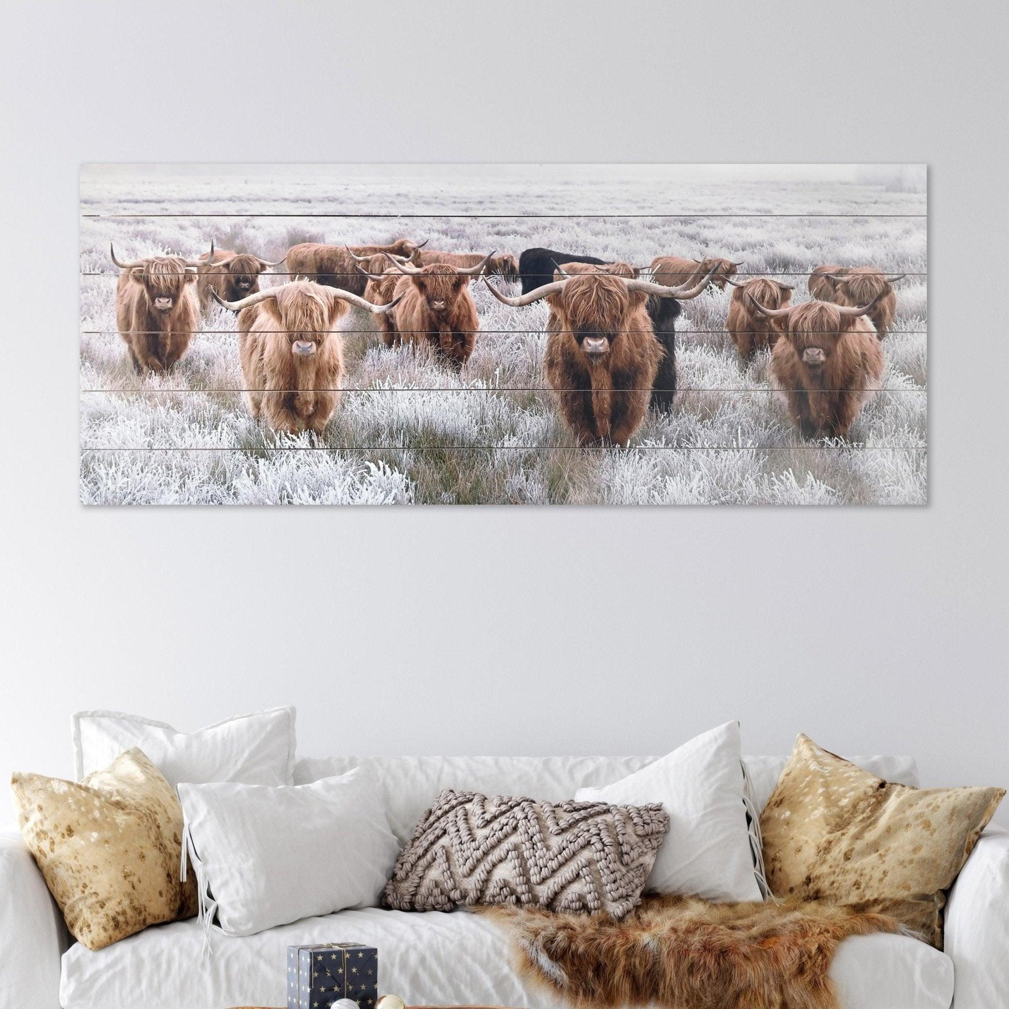 Bring warmth and character to your space with the Highland Cow Herd Wood Plank Wall Art, a charming blend of rustic texture and contemporary Western style. Featuring a peaceful herd of Highland cows, this wood wall art is printed directly onto genuine hardwood planks, allowing natural knots, grain, and tonal variation to show through the artwork for an organic, one-of-a-kind finish.