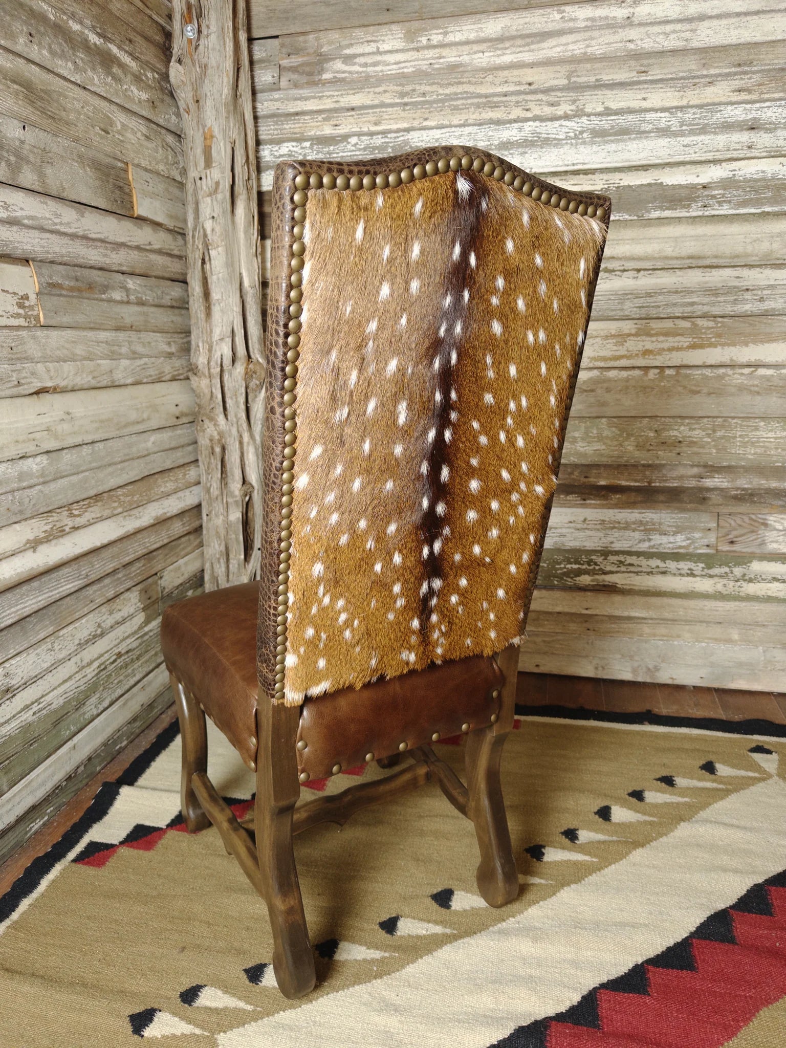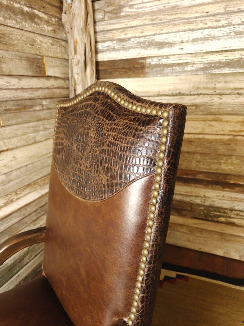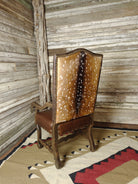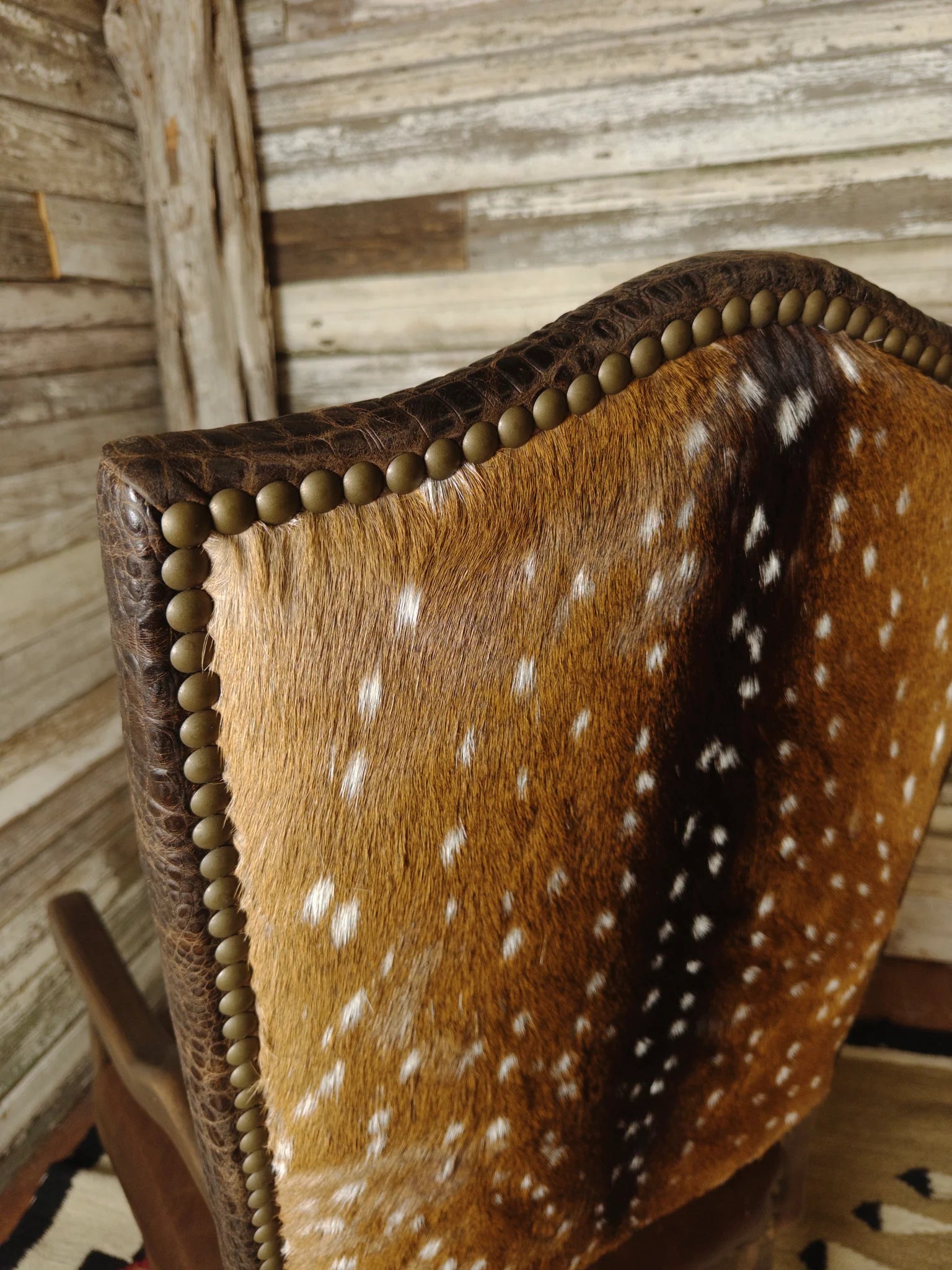 Make a bold statement with the High Country Dining Chair, featuring authentic Axis Deer hide that spans the entire back panel. The striking natural markings create an eye-catching focal point, while Gator Hornback accents in Rustic Walnut frame the design with sophisticated detail. This distinctive combination of premium materials and artisanal craftsmanship transforms your dining room into a showcase of Western luxury and refined taste.