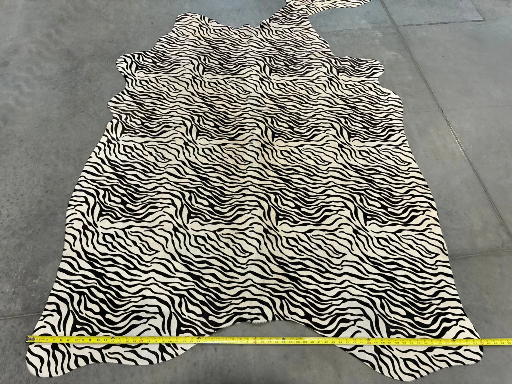 Elevate your interior design with our Baby Zebra on Off white Stenciled Cowhide. Perfect for transforming your upholstery projects or adding dramatic flair to your flooring. Each luxurious full hide spans approximately 35-40 square feet, making a bold statement in any space while maintaining sophisticated elegance.
