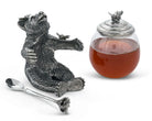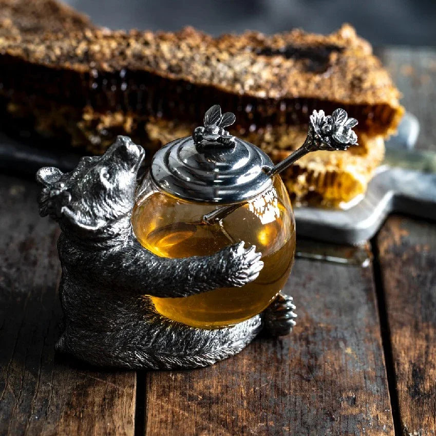 This exquisitely detailed pewter bear serves as both functional honey dispenser and decorative statement piece. The three-dimensional design captures authentic wildlife character, while the glass honey pot nestles securely within the bear's form. A charming bee perches atop the pewter lid, and the included flower-topped honey spoon fits perfectly into its designated slot. Every element—from the lifelike bear craftsmanship to the coordinating bee accent—demonstrates thoughtful design that transforms everyday honey service into an elegant, conversation-worthy display. Ideal for those who value quality craftsmanship and nature-inspired décor that serves a purpose.