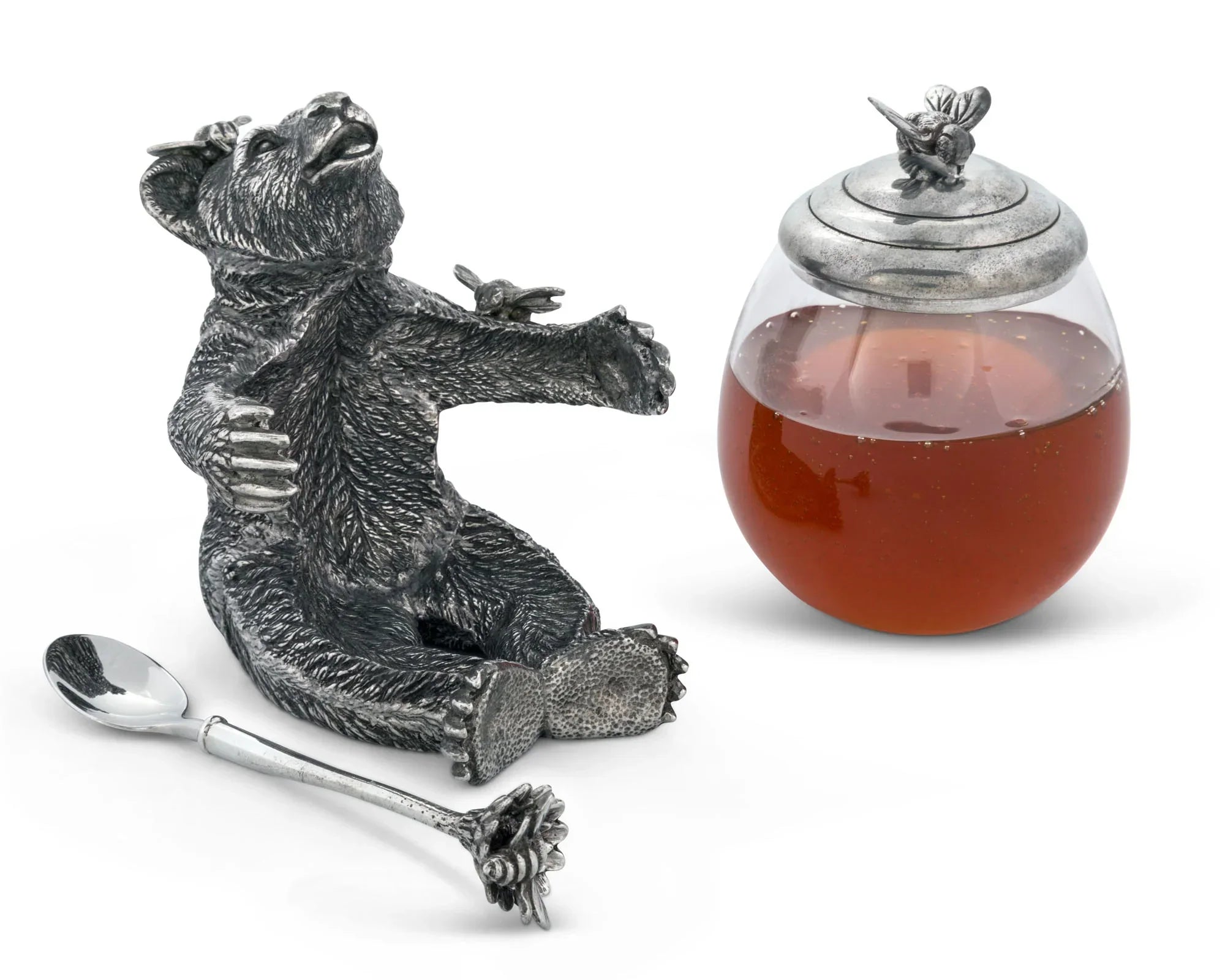 - 4 piece honey pot set includes the pewter bear, glass pot, lid, and spoon.