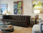 Experience refined rustic elegance with the Camden Leather Sofa, expertly crafted to deliver exceptional comfort and lasting quality. This sophisticated Chesterfield design features distinctive square biscuit tufting and striking Bocote wood accents on the front arm panels, showcasing rich black tones with golden highlights. Complemented by a black walnut plinth base, its mid-century-inspired silhouette conceals an inviting, comfortable seat. Ideal for those seeking a sleek, masculine aesthetic, the Camden Leather Sofa offers a timeless statement piece for any refined living space.