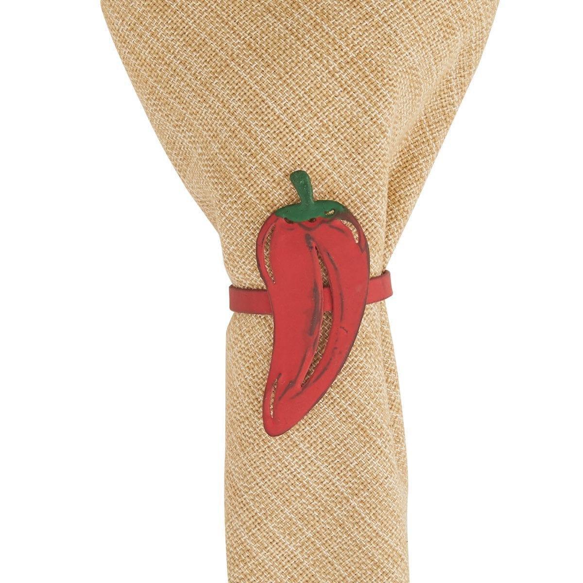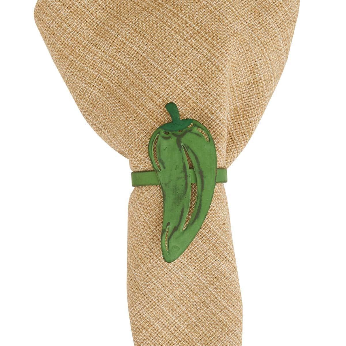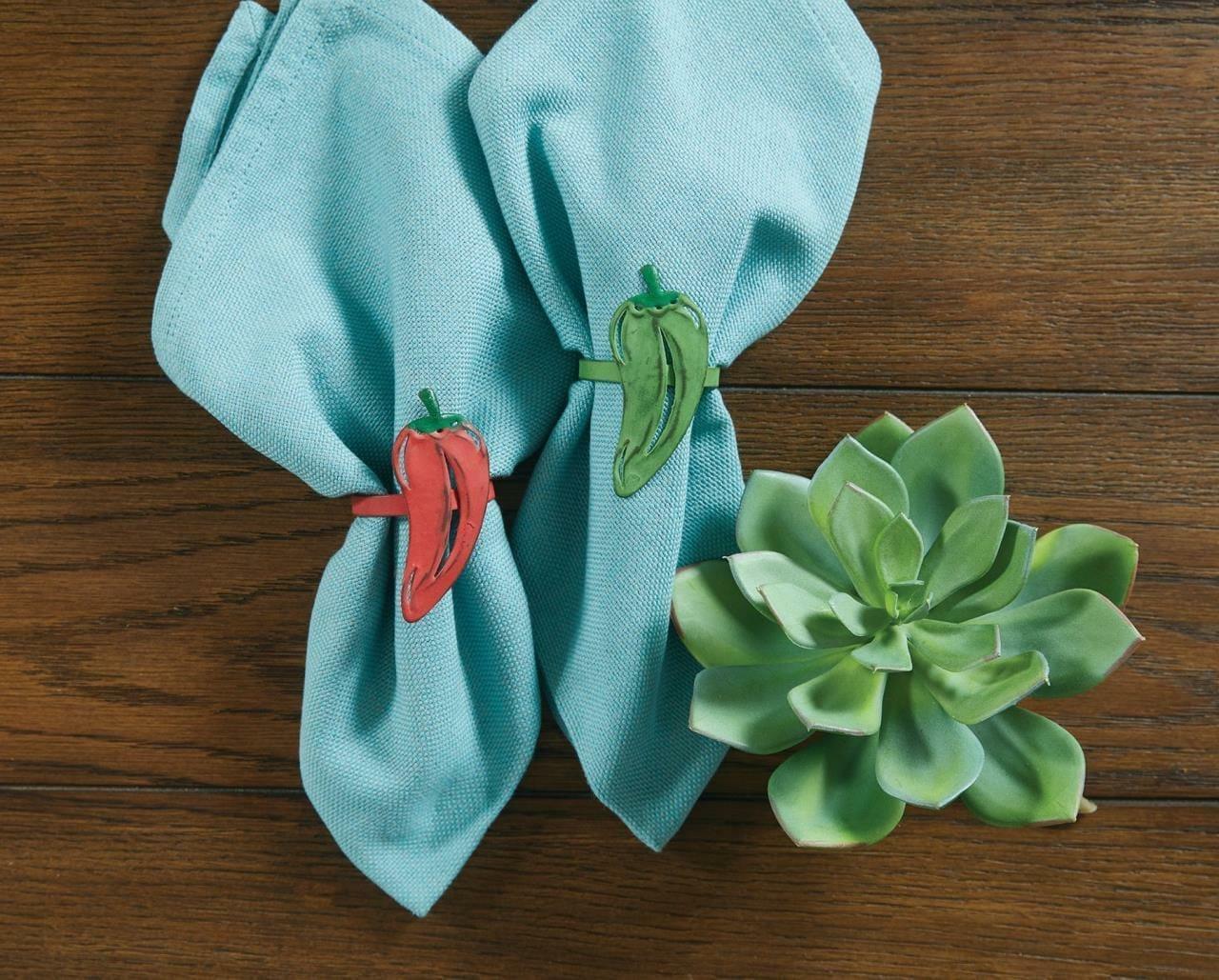 These napkin rings are made of metal, die-cut into cute little chilis available in distressed green and red.
