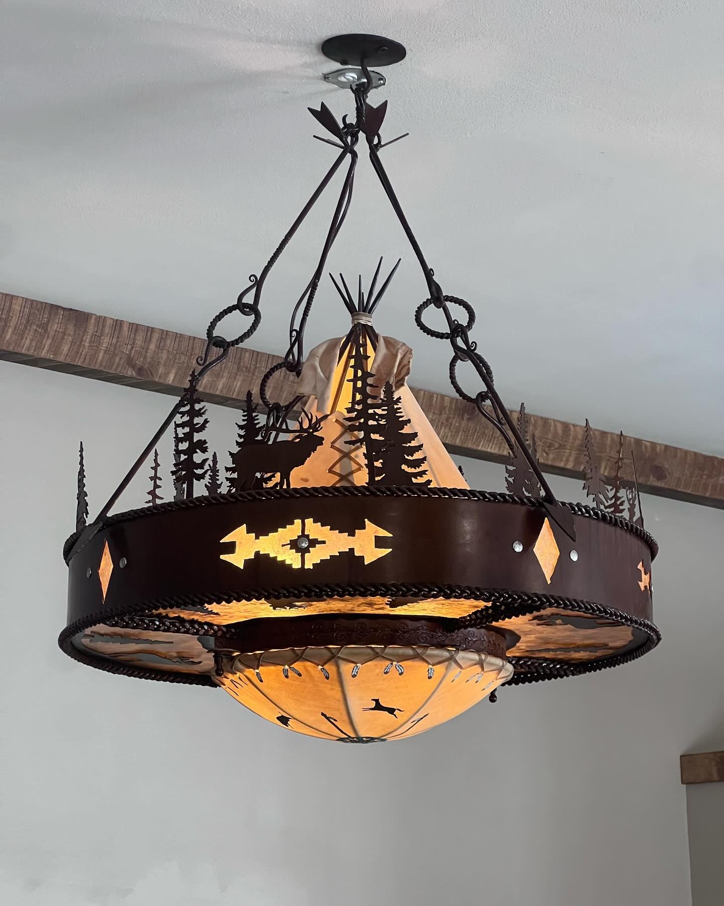 The chandelier features a rawhide tipi on top and a rawhide dome down-light on the bottom, adorned with Aztec designs and paintings to enhance its Native American-inspired rustic luxury.