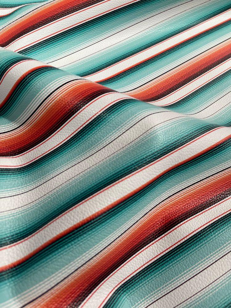 Revamp your home decor with our vibrant Southwestern Serape Painted Leather. This striking leather showcases bursts of bold, uplifting colors that will infuse any room with joy and vitality. Printed in a lively mix of red, aqua, turquoise, and orange stripes, with crisp white accents, this Southwestern Serape Leather is a must-have for adding character to your space.