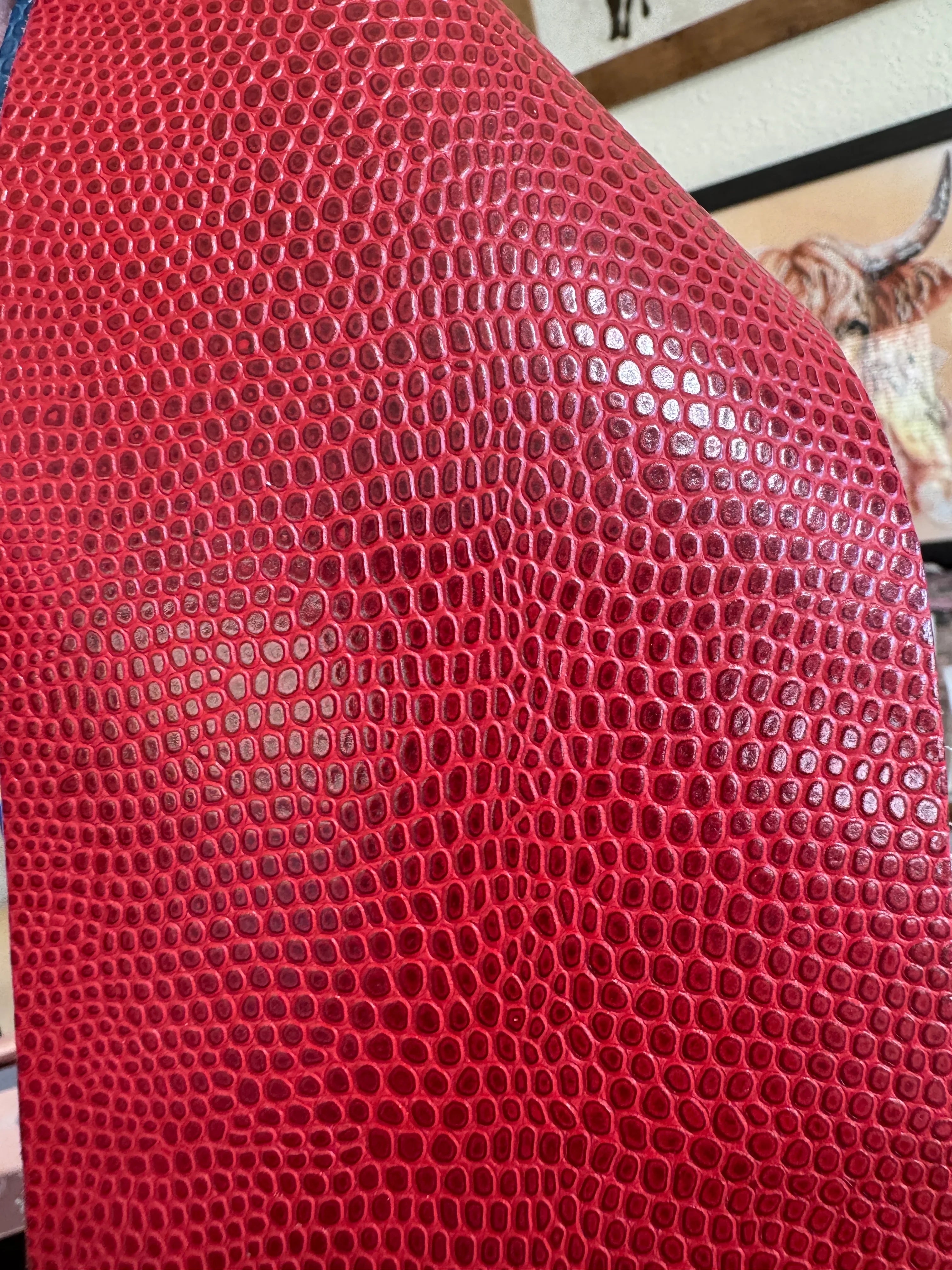 Indulge in the luxurious feel and elaborate design of our Drake Red Lizard Embossed Leather. Each item showcases distinctive shades of red that shift with the light, and intricate lizard embossing that has been meticulously created. The hand-applied patent finish adds an element of distinction, setting our Lizard Gem collection apart. Perfect for those seeking a refined yet rustic appearance.