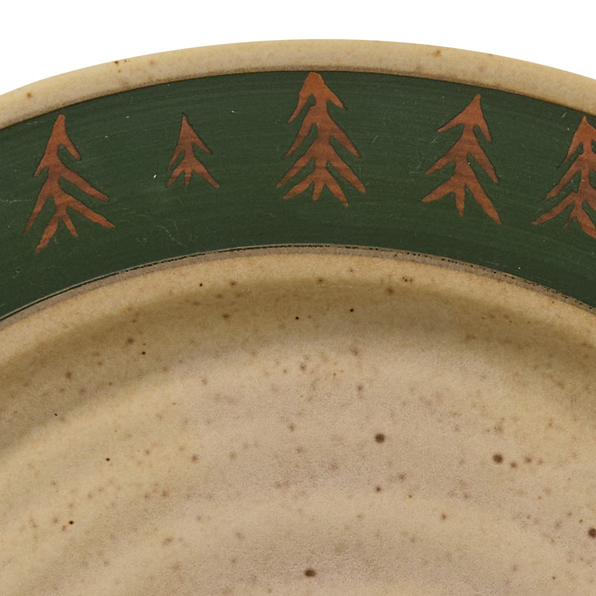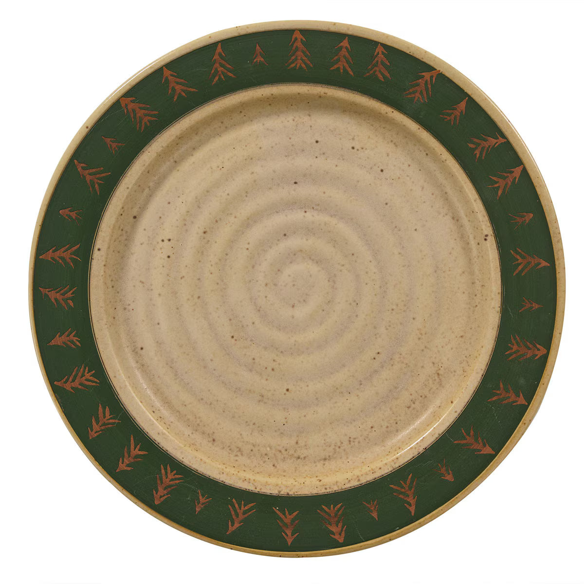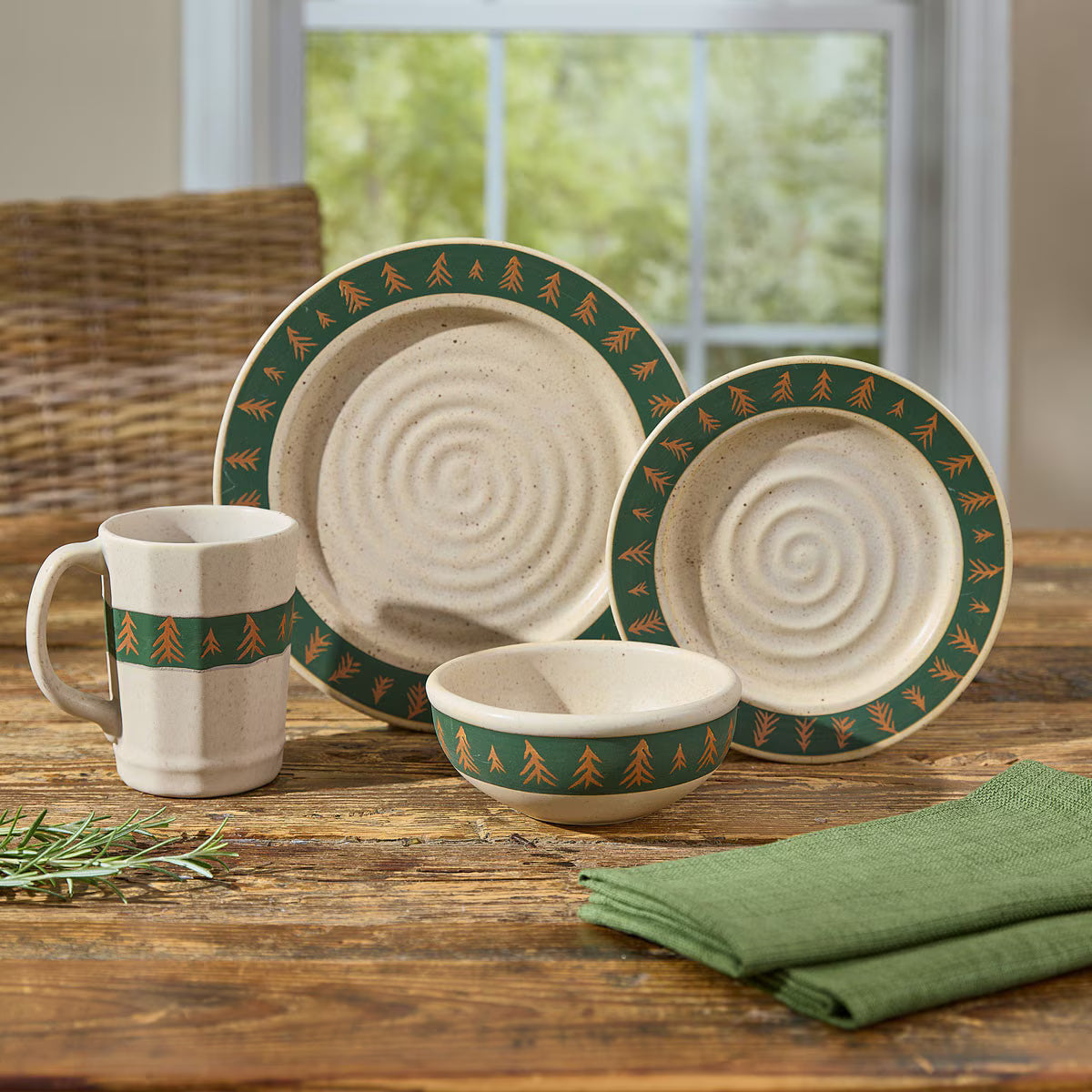 Each piece showcases a unique hand-thrown look with subtle texture and spiral detailing, giving the collection an artisanal feel that pairs beautifully with cabin, lodge, and woodland décor. The deep green rim accented with golden pine trees creates a warm, inviting setting for everyday meals or weekend gatherings at the cabin.
