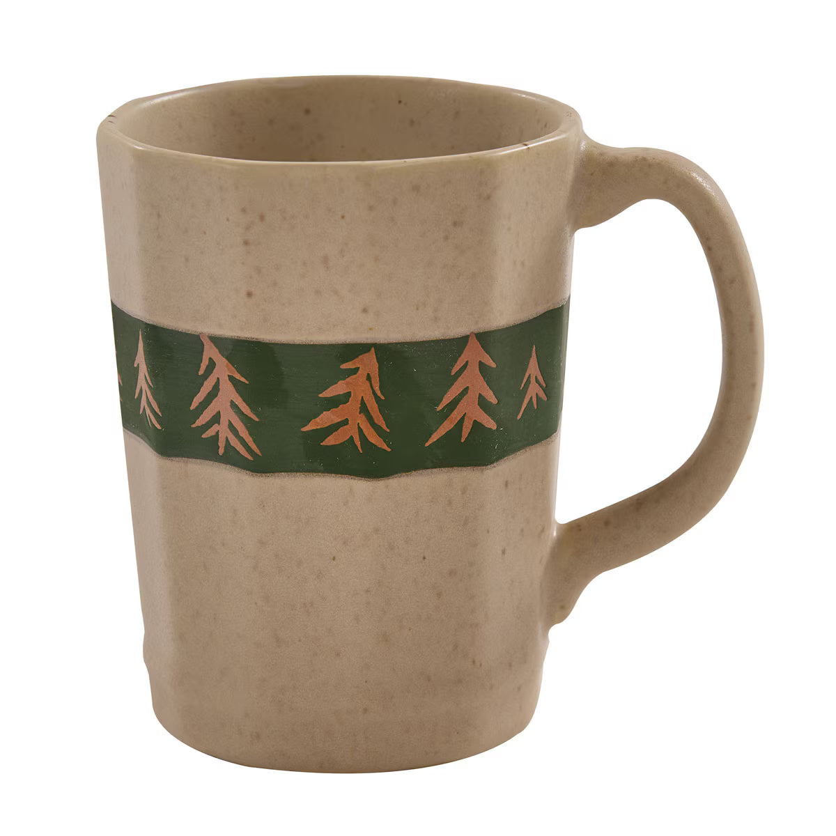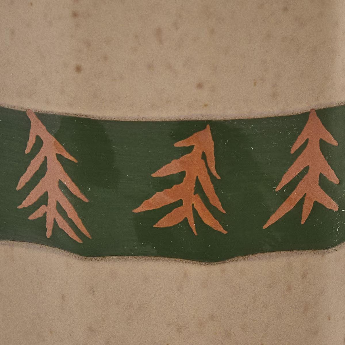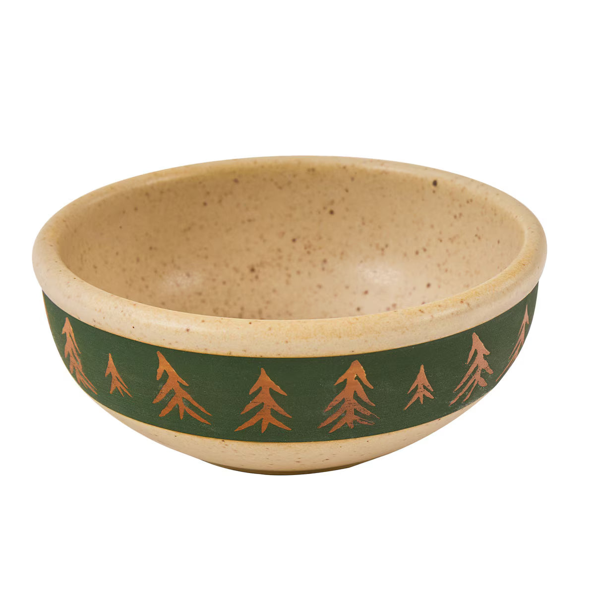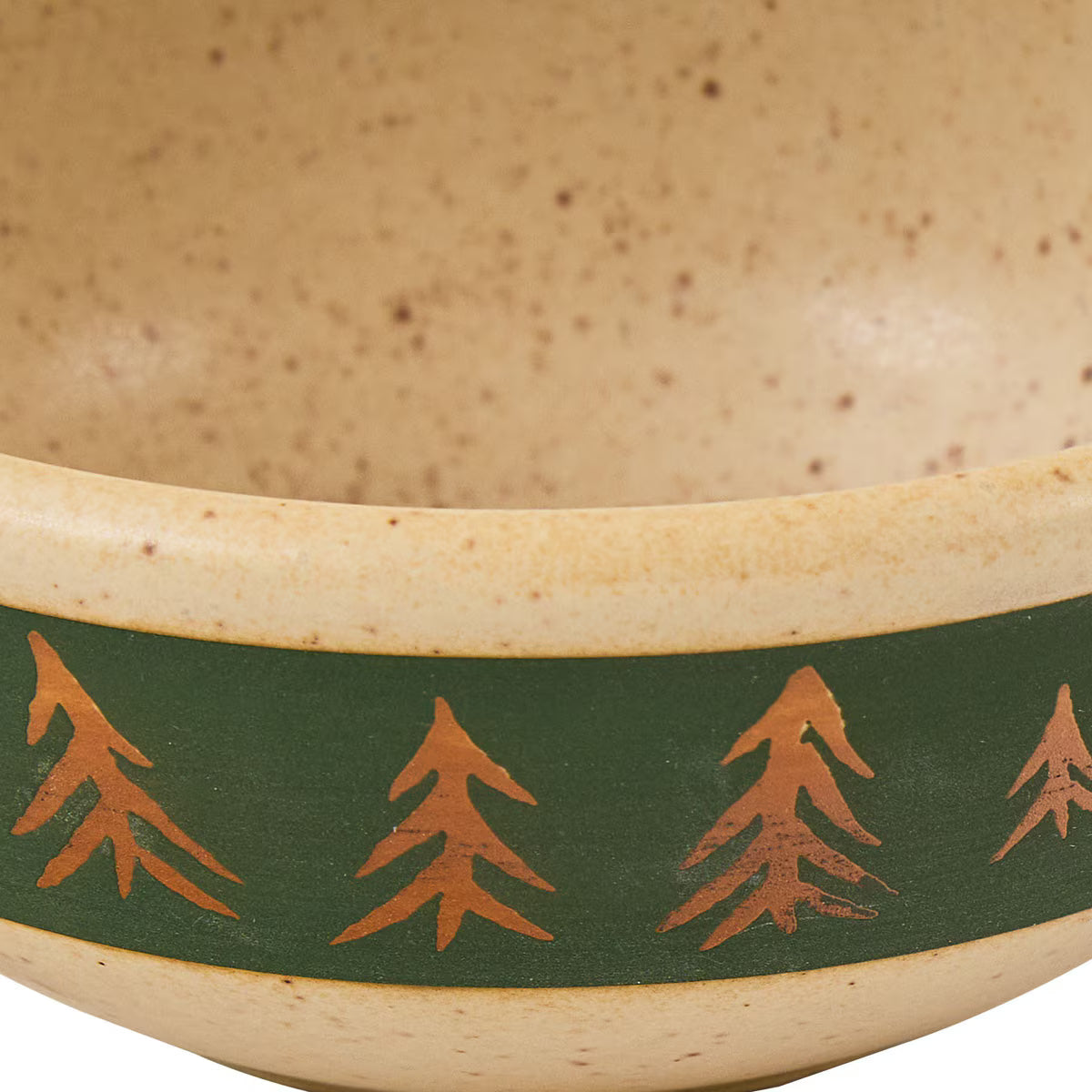Each piece showcases a unique hand-thrown look with subtle texture and spiral detailing, giving the collection an artisanal feel that pairs beautifully with cabin, lodge, and woodland décor. The deep green rim accented with golden pine trees creates a warm, inviting setting for everyday meals or weekend gatherings at the cabin.