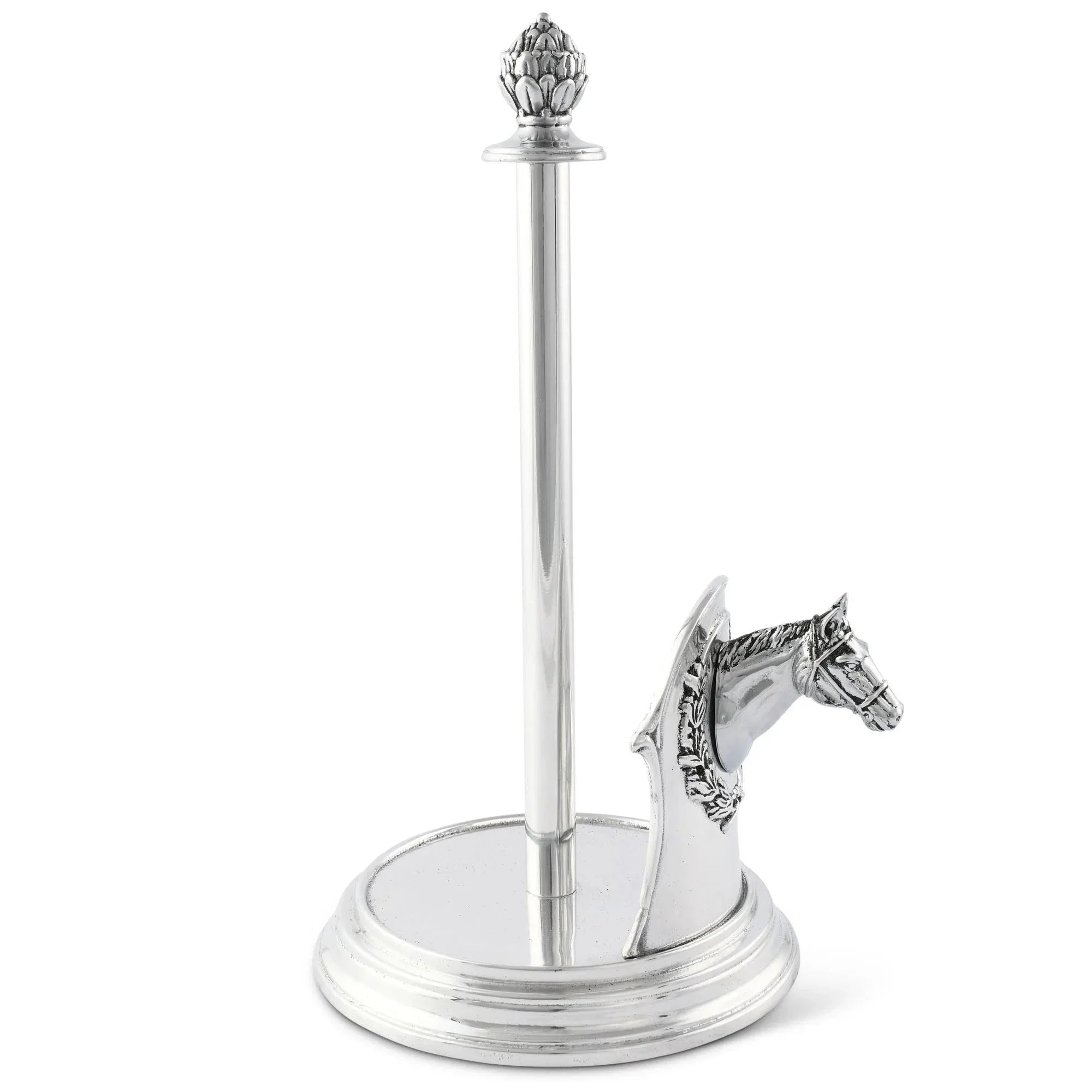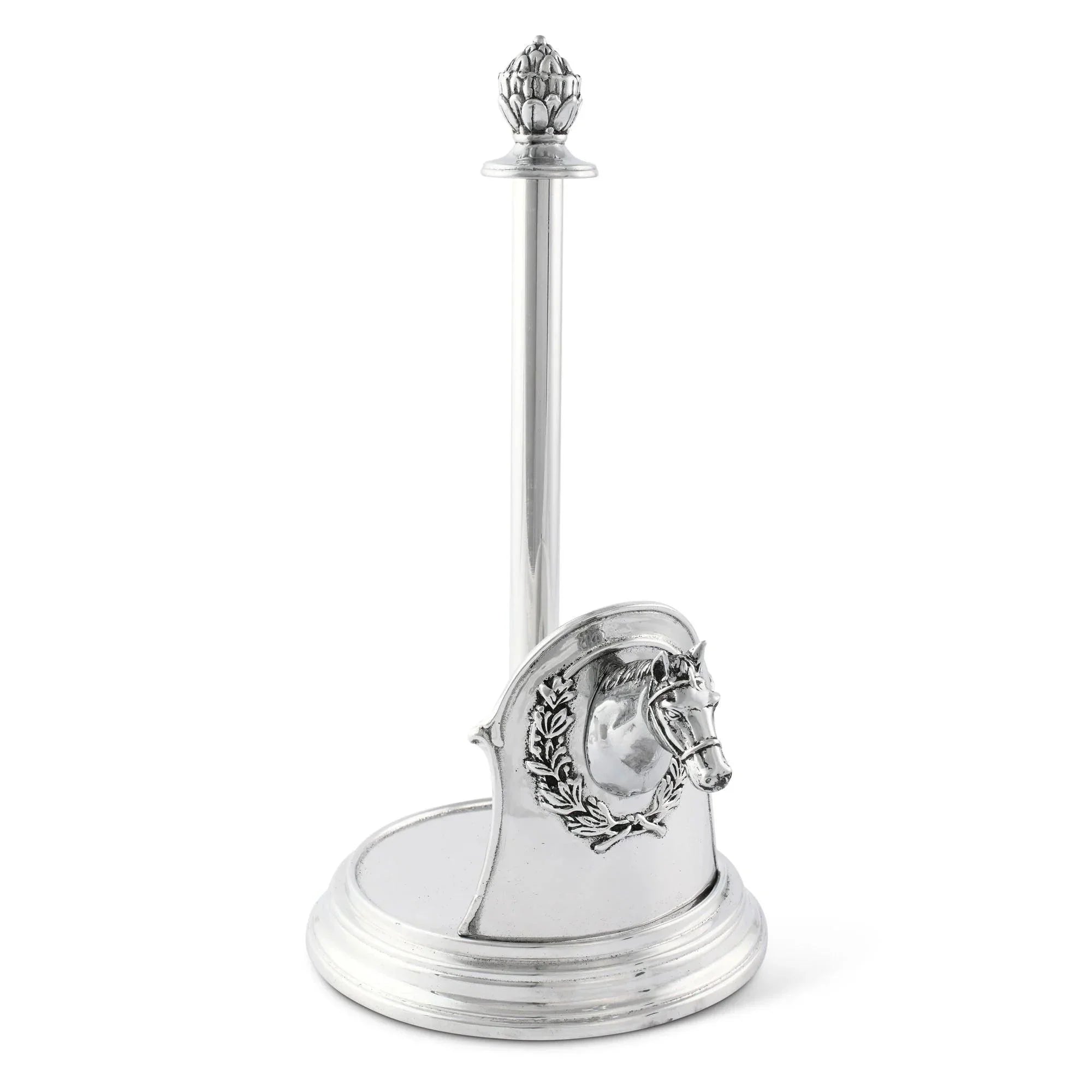 For additional charm, this equestrian-themed aluminum paper towel holder sports a botanical-inspired top finial. The sturdy base prevents toppling, and the single center rod makes exchanging a new roll for an old one simple.