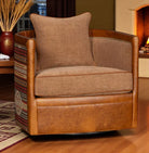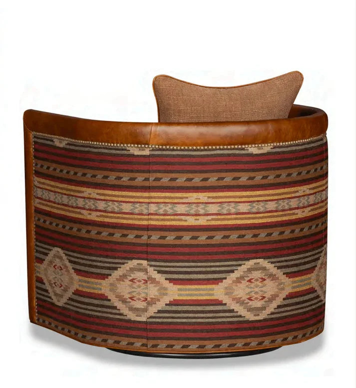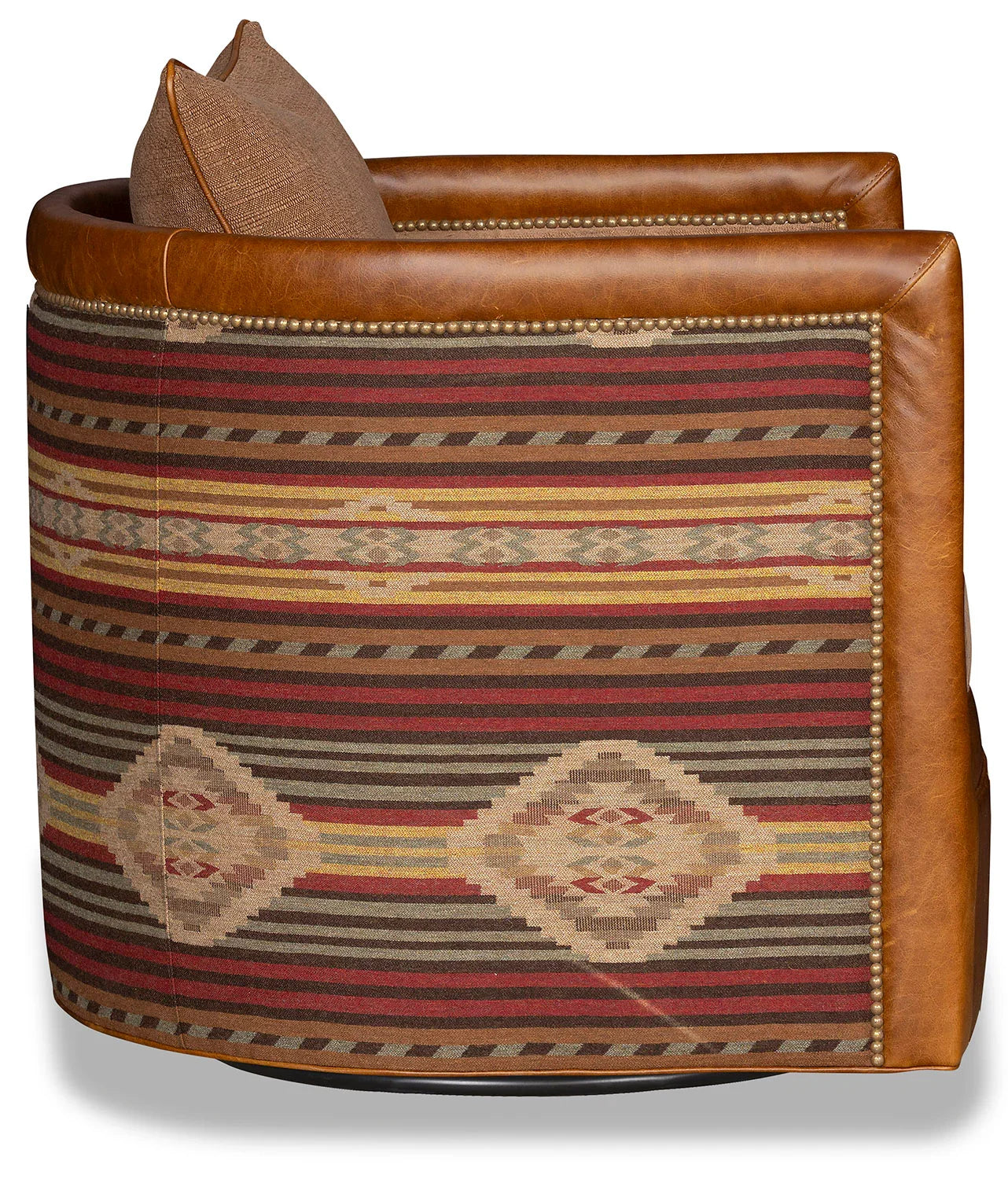 Experience the Keever Southwestern Swivel Chair, crafted with authentic top grain leather and complemented by a rich two-tone brown polyester fabric. Its eye-catching Southwestern patterned upholstery, featuring vibrant stripes and geometric designs, brings a warm, rustic charm to any space. This chair not only enhances your room’s style but also offers a unique, inviting focal point that will captivate guests and elevate your décor. Make this stunning Southwestern piece the centerpiece of your home today.