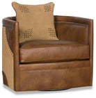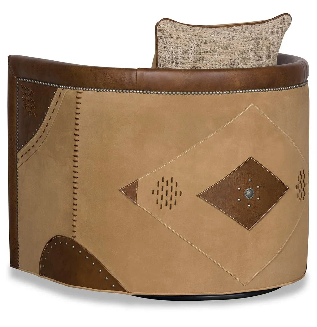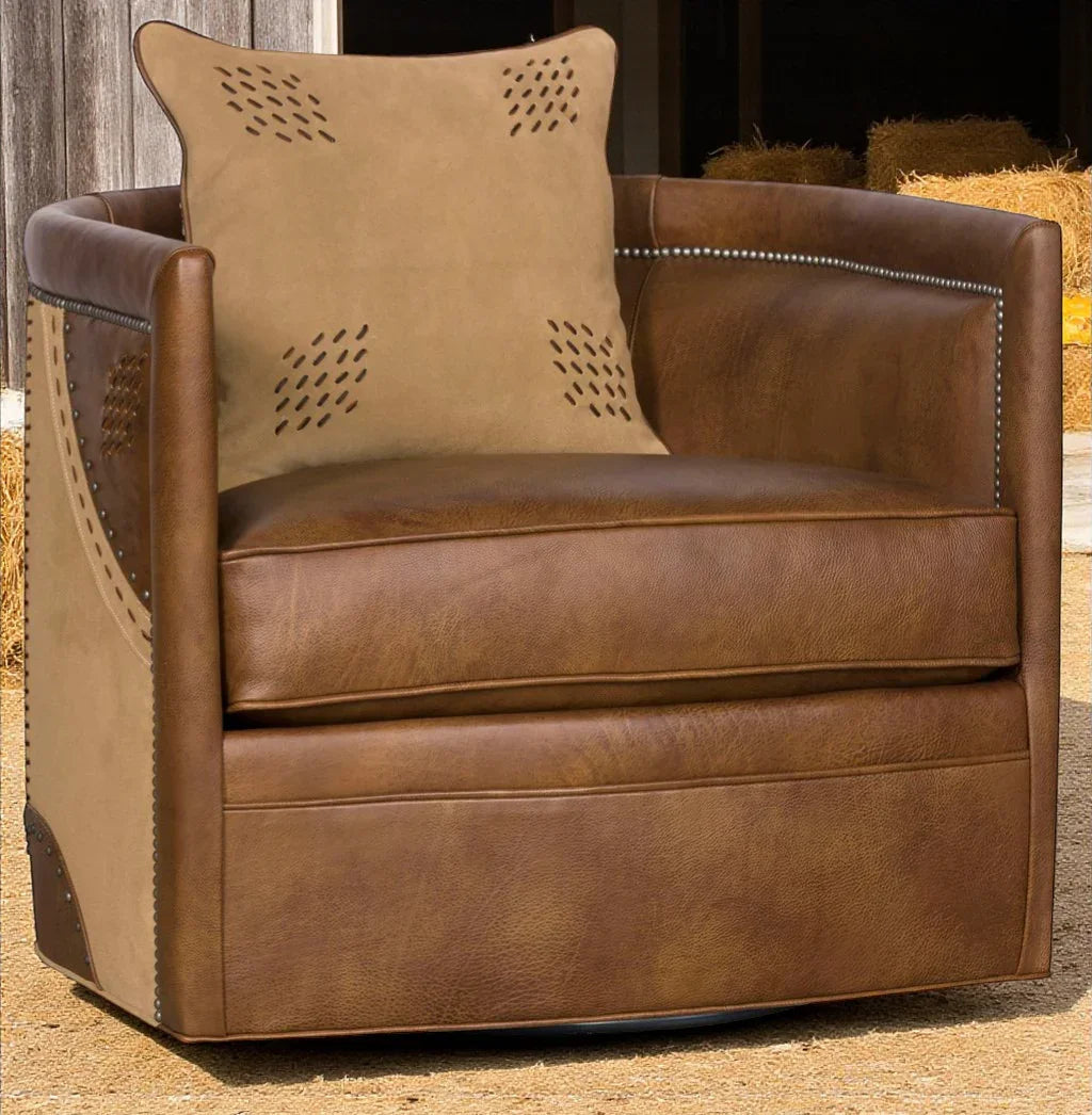 The Keever Western Leather Swivel Chair showcases genuine top grain leather in a sophisticated two-tone brown finish. Its striking western-patterned upholstery, detailed with saddle stitching and nailhead trim, adds a warm, rustic elegance to any room. This chair not only elevates your décor with its distinctive style but also serves as an inviting focal point that will impress guests. Bring a touch of refined western charm into your home with this exceptional piece.