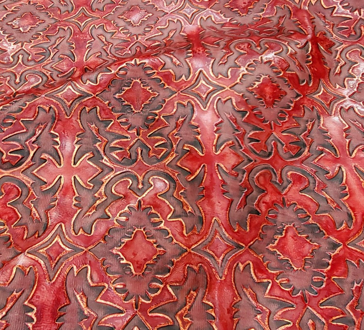 Experience the luxurious look and feel of our Laredo Red Bronze Embossed Leather. With its bold red color and subdued grey undertones, this western upholstery leather glimmers in any lighting thanks to its metallic bronze shimmer. Perfect for high-end upholstery projects that demand a touch of opulence.